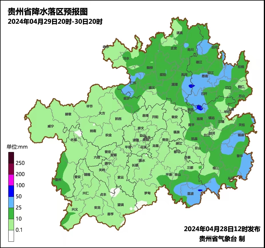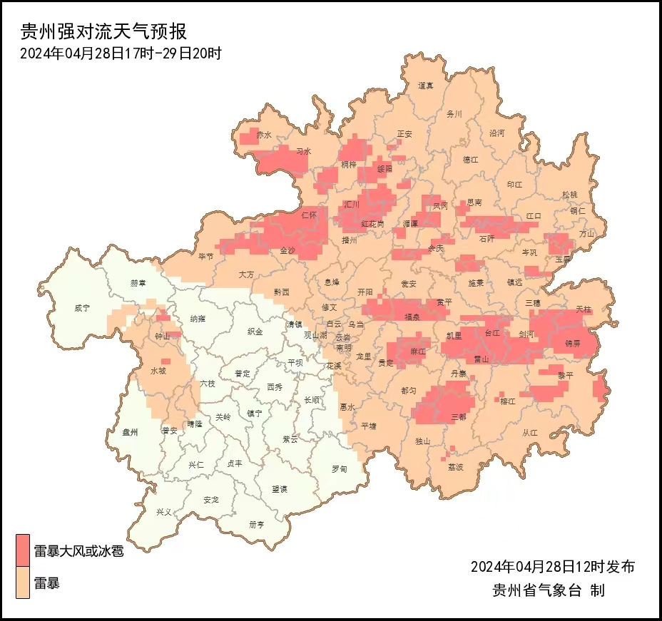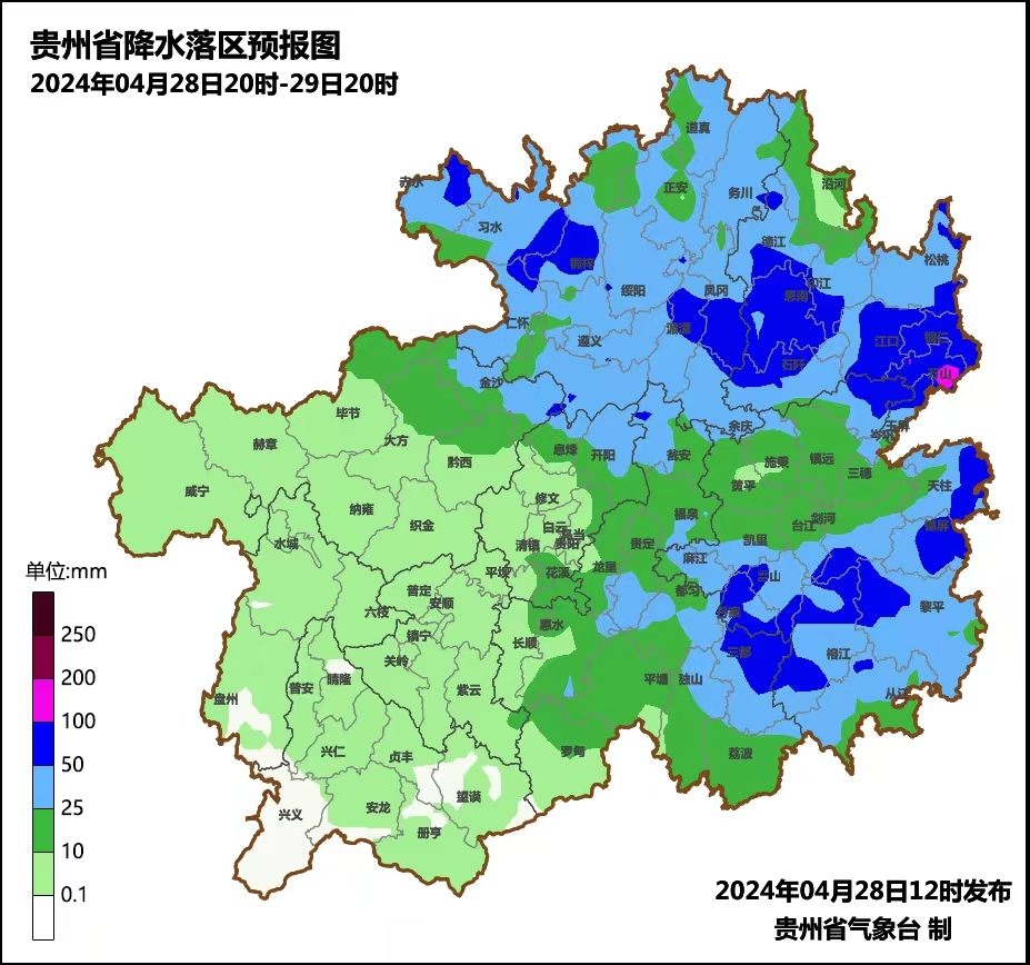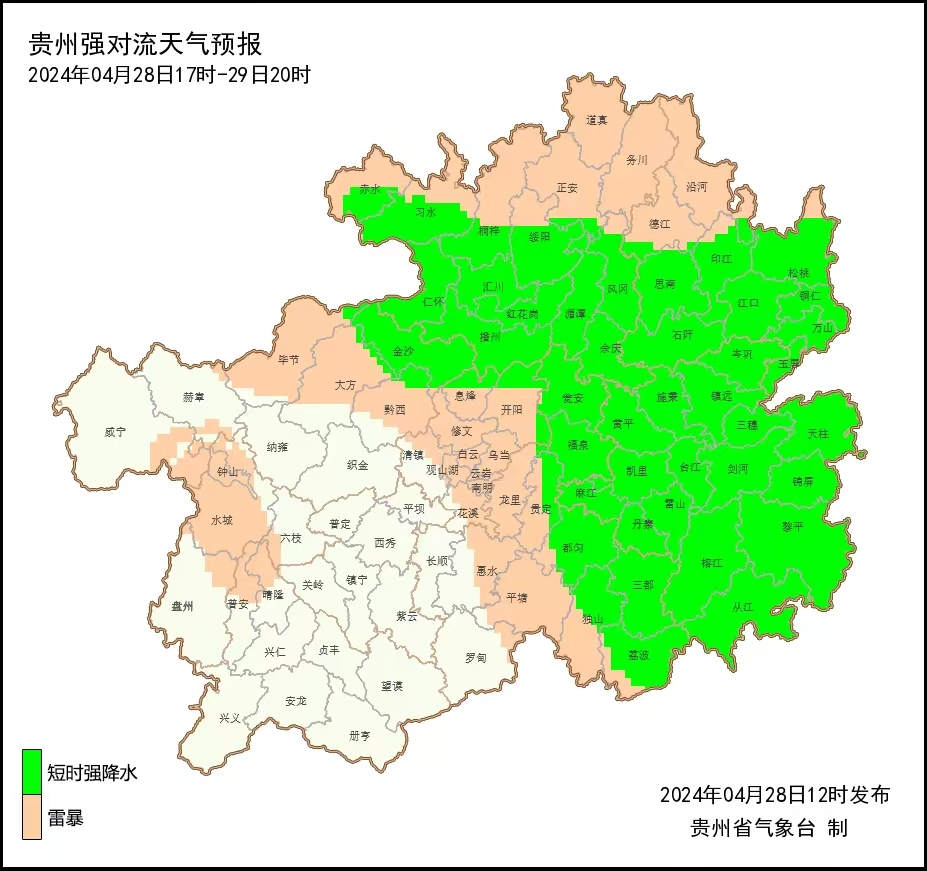 根据最新气象资料分析,今天(4月28日)傍晚至29日夜间,贵州省中部以北以东地区将出现强降水和强对流天气,其中,今天傍晚到29日中午将影响省的中北部地区,毕节市东部、遵义市、铜仁市、贵阳市北部和东部、黔南州北部、黔东南州北部有大到暴雨,个别乡镇有大暴雨;29日午后到夜间将影响省的东部地区,黔南州中南部、黔东南州有大到暴雨。上述地区雷雨中伴有冰雹、大风、短时强降水等强对流天气。此次过程累计降水量为50~110毫米,最大可达130毫米,最大小时雨强达40~60毫米/小时。