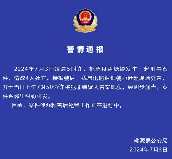 湖南常德桃源县公安局3日在官方微信号发布通报,2024年7月3日凌晨5时许,桃源县盘塘镇发生一起刑事案件,造成4人死亡。接报警后,该局迅速组织警力赶赴现场处置,并于当日上午7时50分许将犯罪嫌疑人曾某初抓获。经初步调查,案件系邻里纠纷引发。