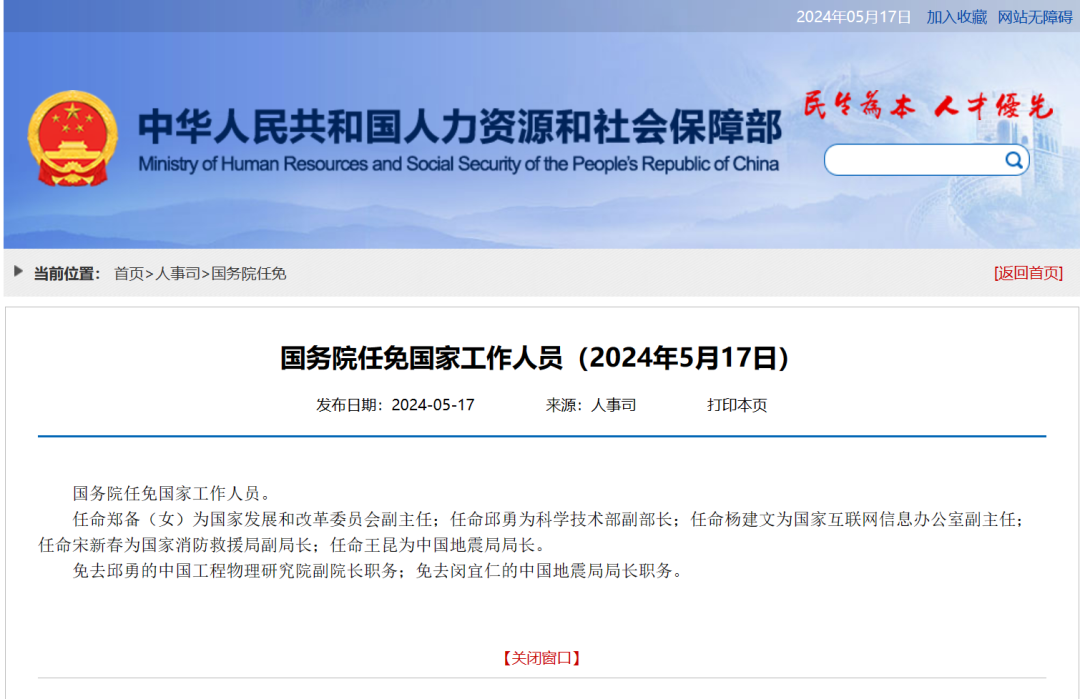 人社部网站5月17日消息,国务院任免国家工作人员。