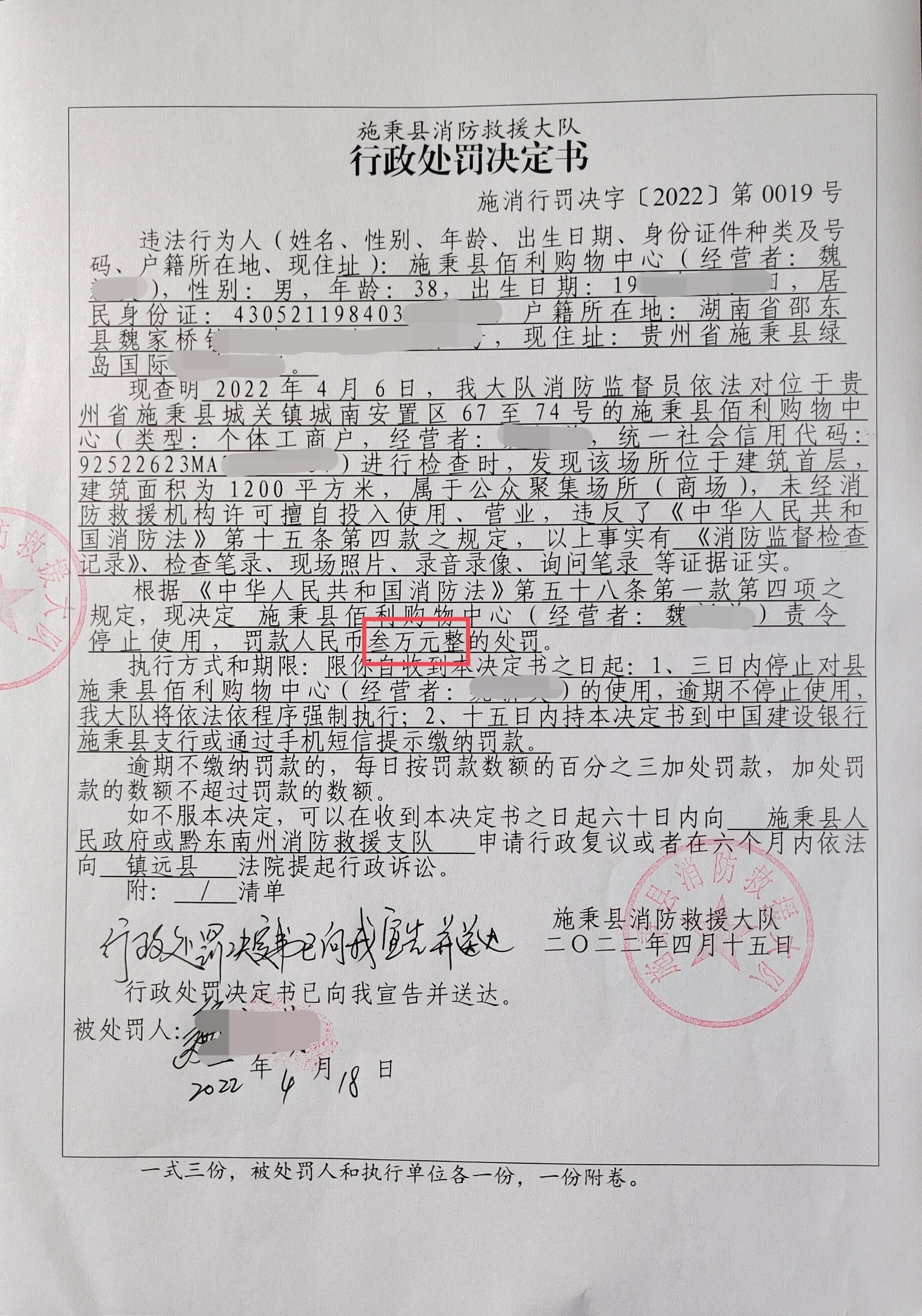 在此之前,施秉县消防救援大队已多次上门提醒,该场所负责人营业前必须到消防部门申请办理消防行政许可证,但该场所负责人仍然执意无证经营。针对这一违法行为,施秉县消防救援大队监督执法人员立即对现场进行了拍照取证,同时通知场所负责人到队接受调查。根据《中华人民共和国消防法》第五十八条第一款第四项之规定,施秉县消防救援大队给予购物中心责令停止使用,并处罚款人民币30000元整的行政处罚。