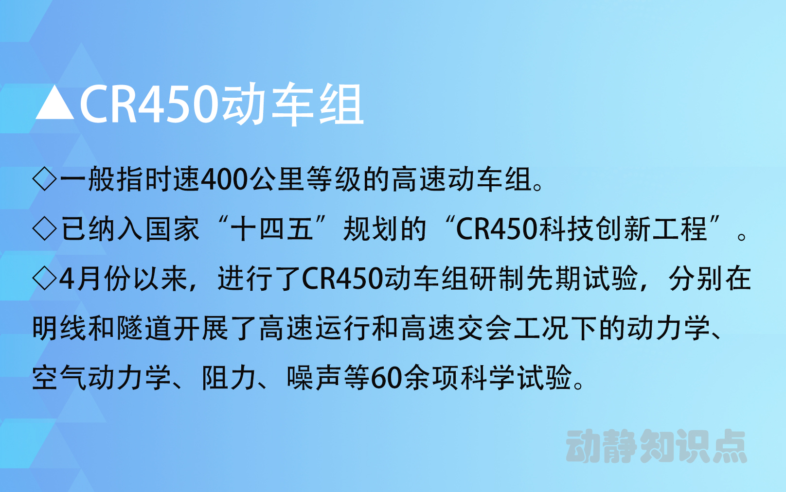 ▲由我国自主研发、世界领先新型复兴号高速综合检测列车已上线运行。4月21日,该车成功实现明线上单列时速435公里、相对交会时速达870公里,创造了高铁动车组列车明线和隧道交会速度世界纪录。将为CR450动车组研制提供重要技术支撑和引领,也将为时速350公里安全标准示范线建设提供重要支持和保障。