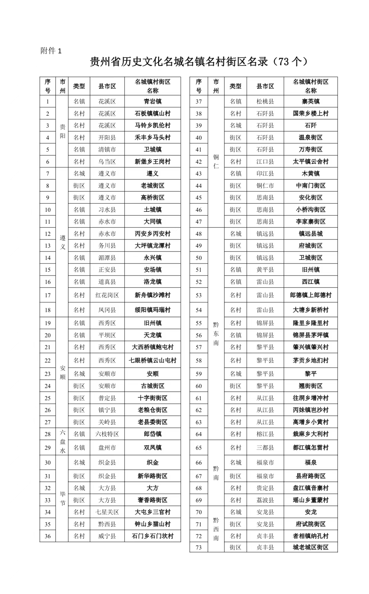 贵州历来高度重视历史文化保护工作,遵义、镇远分别于1982年、1986年获得第一、第二批国家历史文化名城称号。截止目前,贵州有世界文化遗产1处,中国传统村落724个,国家级少数民族特色村寨312个,馆藏可移动文物17万件,文物保护单位4000多处,其它不可移动文物14000多处,文化名城、名镇、名村、街区共计73个,确定历史建筑1522个,类型多样,底蕴深厚,充分体现了多彩多元的文化历史价值。