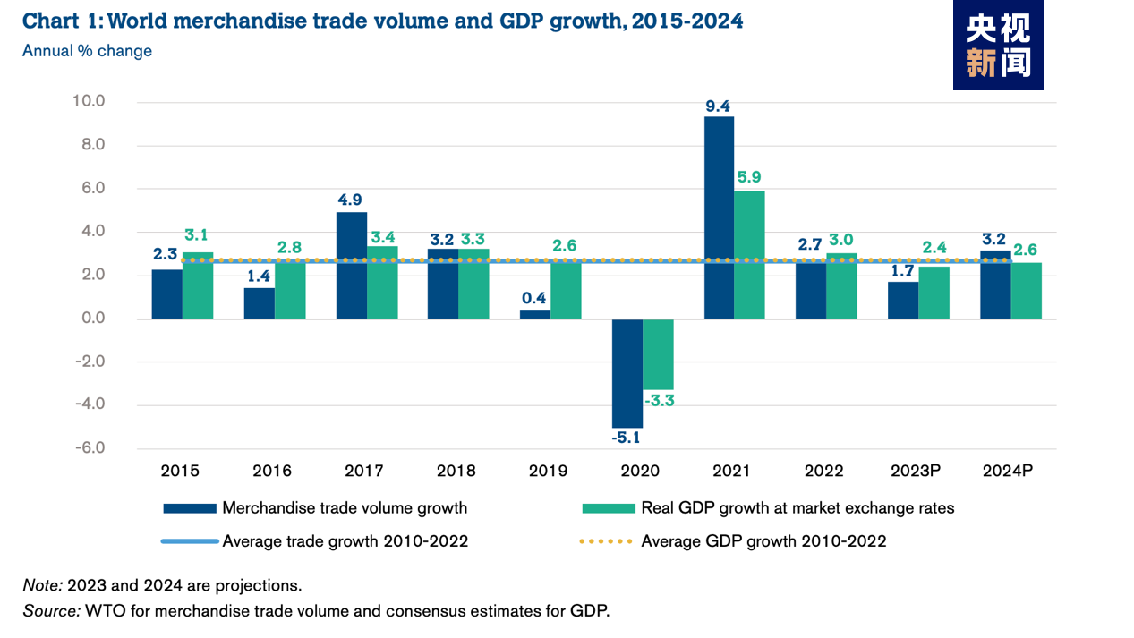 在这份报告中,世贸组织还预测2023年按市场汇率计算的全球实际GDP增长率为2.4%。而展望2024年,全球商品贸易量增长率和GDP增长率将分别回升至3.2%和2.6%,但由于存在大量的下行风险,包括地缘政治紧张局势、粮食供应冲击,以及货币紧缩可能带来的不可预见的后果,对2024年的预测比平时更加具有不确定性。