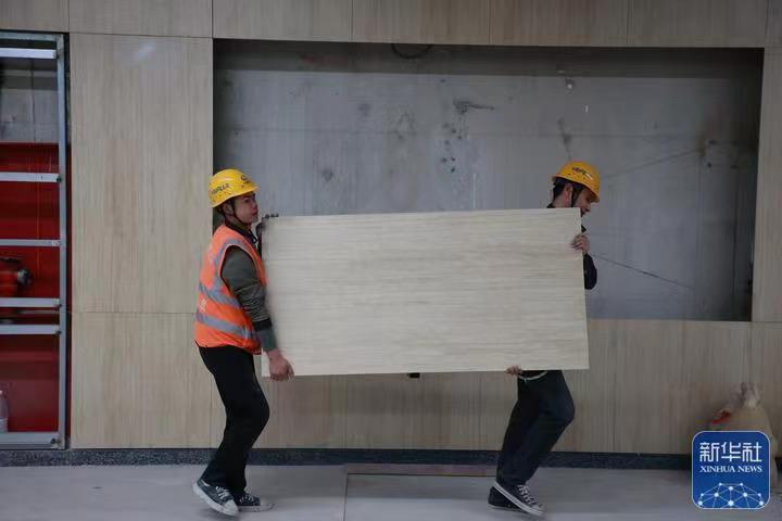 5月4日,两名中铁五局工作人员在东风镇站内安装装饰面板