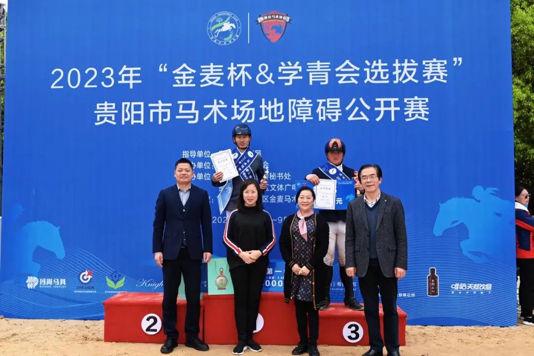 华中师范大学副校长蔡红生,贵阳市体育局副局长赵雪梅,贵州金麦马术董事长及贵州省马术协会荣誉会长魏凤英女士,贵州省马术协会会长付涛,贵州省马术协会秘书长谈勋,贵商总会常务副会长、秘书长、诚祥投资集团董事长孔祥柱,香港志成集团总经理郭志威,香港志成集团东莞有成电器制品有限公司总经理周诗斌,贵州习酒销售有限责任公司黔中区副总经理赵华,裁判长崔臣,四川豪威马术俱乐部总经理张超等领导出席了2023年“金麦杯&学青会选拔赛”贵阳市马术场地障碍公开赛开幕式并为所有比赛进行了颁奖。