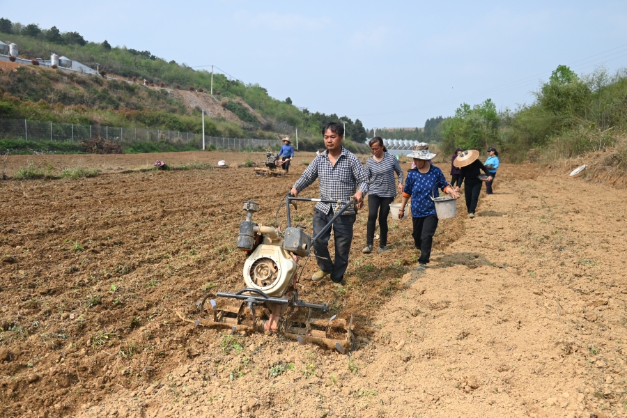 走进贵州省岑巩县天马镇苗落村高粱种植基地,2台旋耕机与村民协同作业,进行高粱种植,机械轰鸣声与村民说笑声交相呼应,一派繁忙的劳作景象。