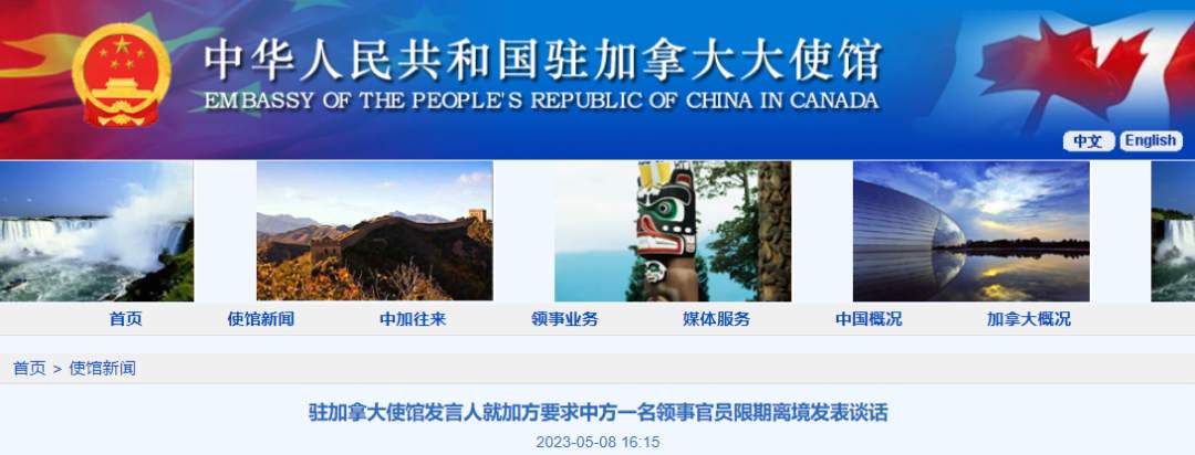 5月8日,加拿大政府基于个别政客和媒体所谓“中国干涉加内政”的谎言,公然宣布中国驻多伦多总领馆一名领事官员为“不受欢迎的人”。这严重违反国际法和国际关系基本准则,严重违反中加双边相关协定,蓄意破坏中加关系。中方强烈谴责并坚决反对,已向加方提出严正抗议。中方将坚决采取反制措施,由此产生的一切后果由加方承担。