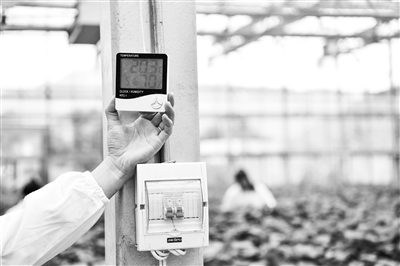 工作人员查看育苗大棚内温湿度。新华社记者 杨文斌摄