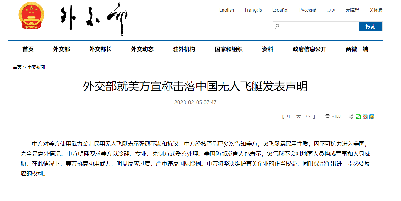 2月5日,外交部就美方宣称击落中国无人飞艇发表声明: