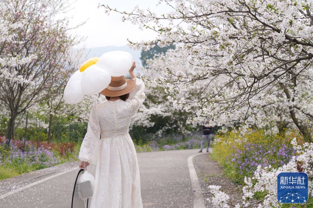 ↑3月19日,游人在重庆市北碚区澄江镇五一村“樱花橘香”农业公园观赏樱花。