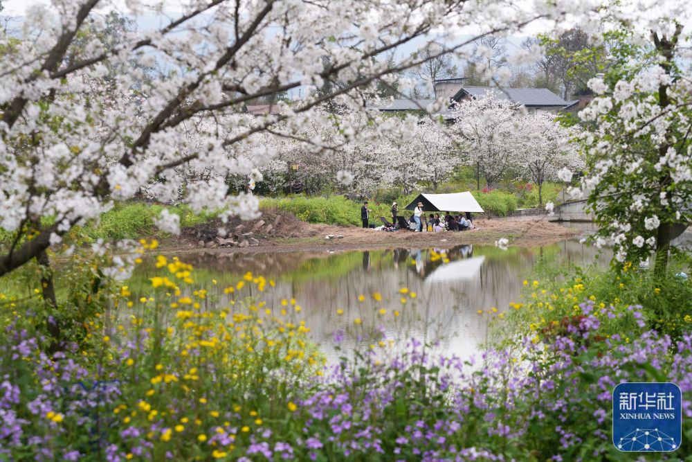 ↑3月19日,游人在重庆市北碚区澄江镇五一村“樱花橘香”农业公园的樱花树下露营游玩。