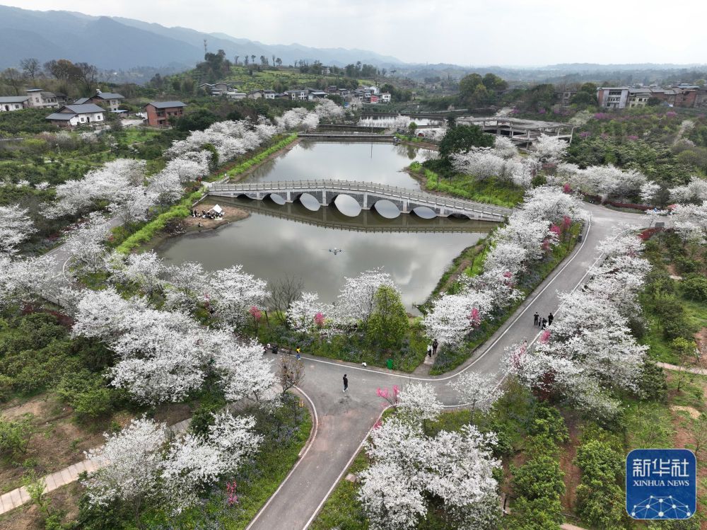 ↑这是3月19日拍摄的重庆市北碚区澄江镇五一村“樱花橘香”农业公园景色(无人机照片)。