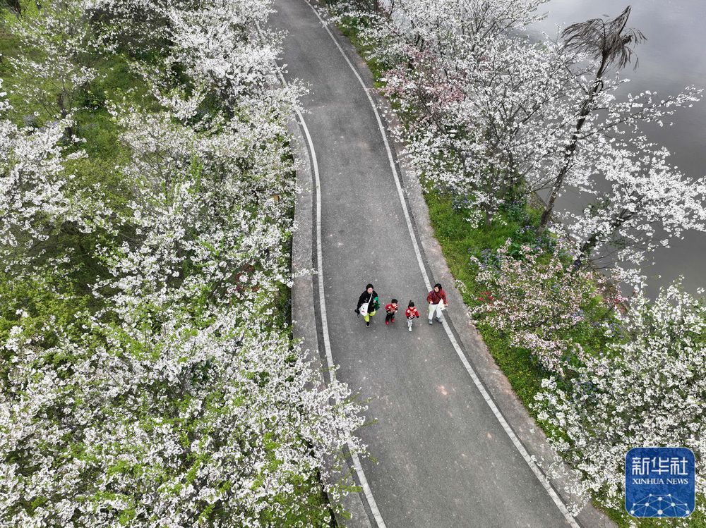↑3月19日,游人在重庆市北碚区澄江镇五一村“樱花橘香”农业公园观赏樱花(无人机照片)。