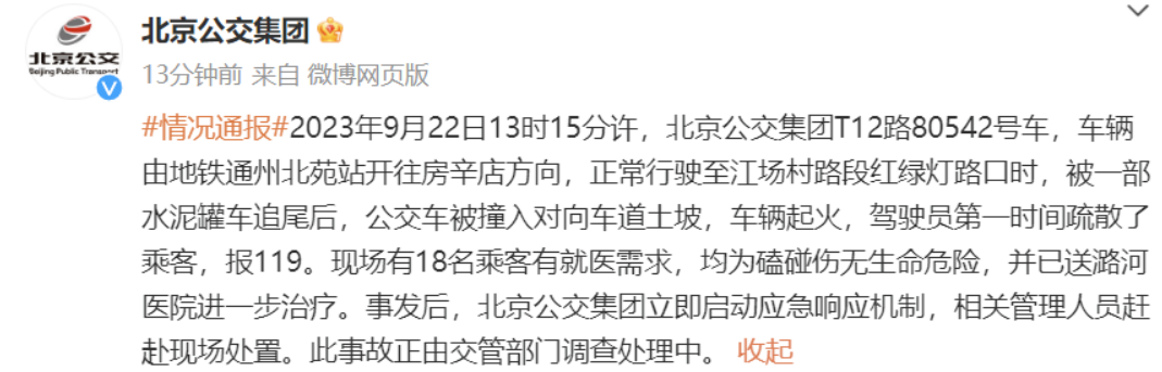 9月22日中午,北京公交T12路一公交车发生交通事故。15时许,北京公交集团官方微博就此事发布一则情况通报。