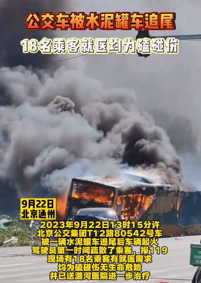 2023年9月22日13时15分许,北京公交集团T12路80542号车,车辆由地铁通州北苑站开往房辛店方向,正常行驶至江场村路段红绿灯路口时,被一部水泥罐车追尾后,公交车被撞入对向车道土坡,车辆起火,驾驶员第一时间疏散了乘客,报119。