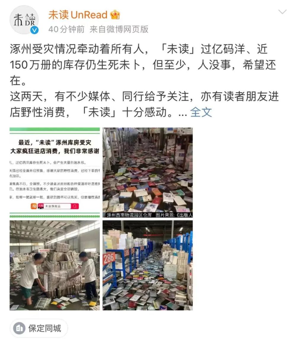 @未读UnRead 表示,该公司过亿码洋、近150万册的库存仍生死未卜,但至少人没事,希望还在。