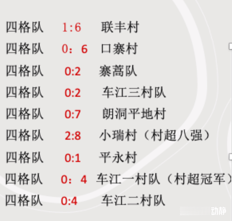 这张不太给力的成绩单属于四格队。9场比赛全部输掉,还丢了40个球,“村超”十大精彩进球之一的这个“倒挂金钩”,打破的就是四格队的大门,以至于他们被媒体称为“村超”最弱的一支球队。