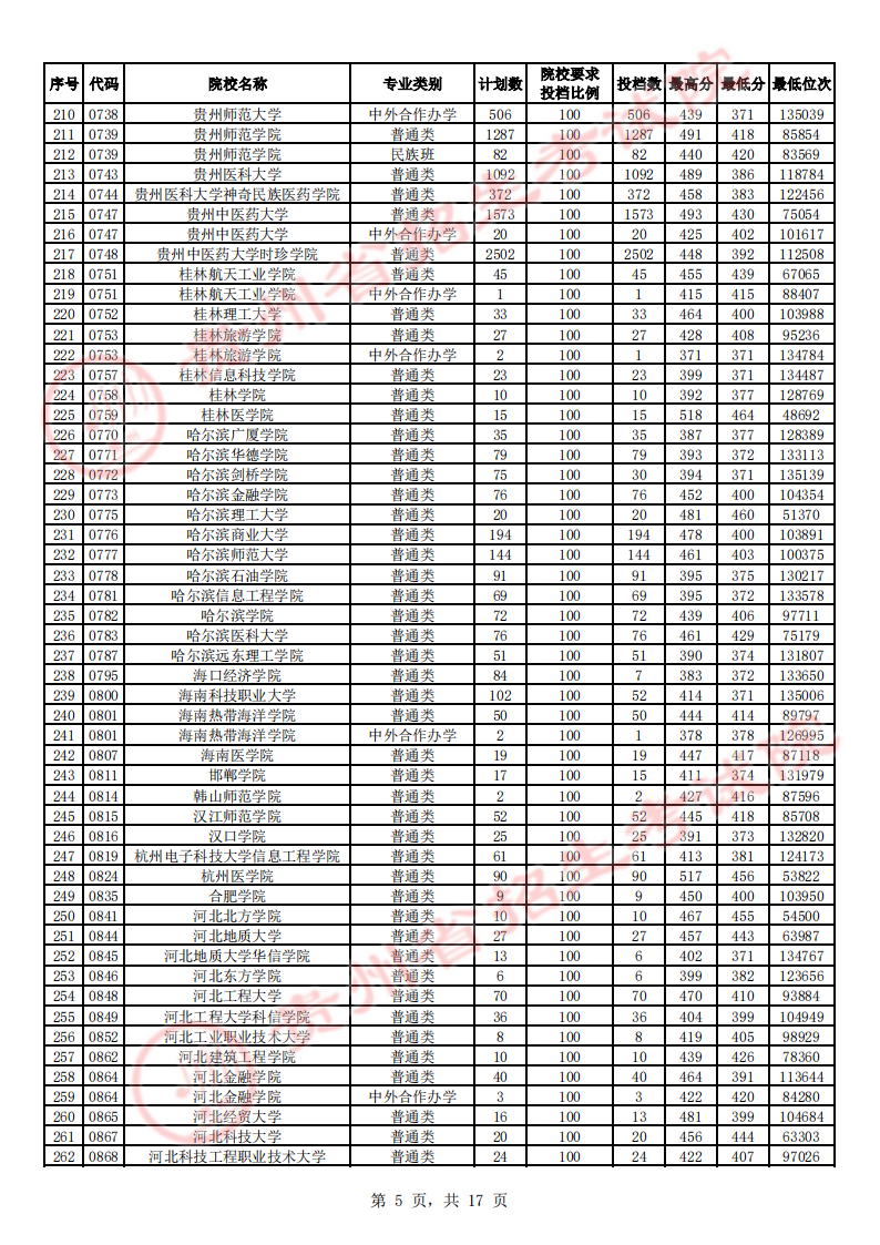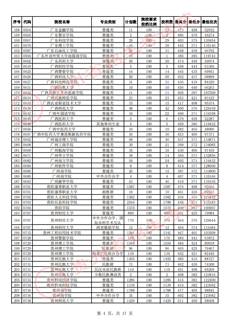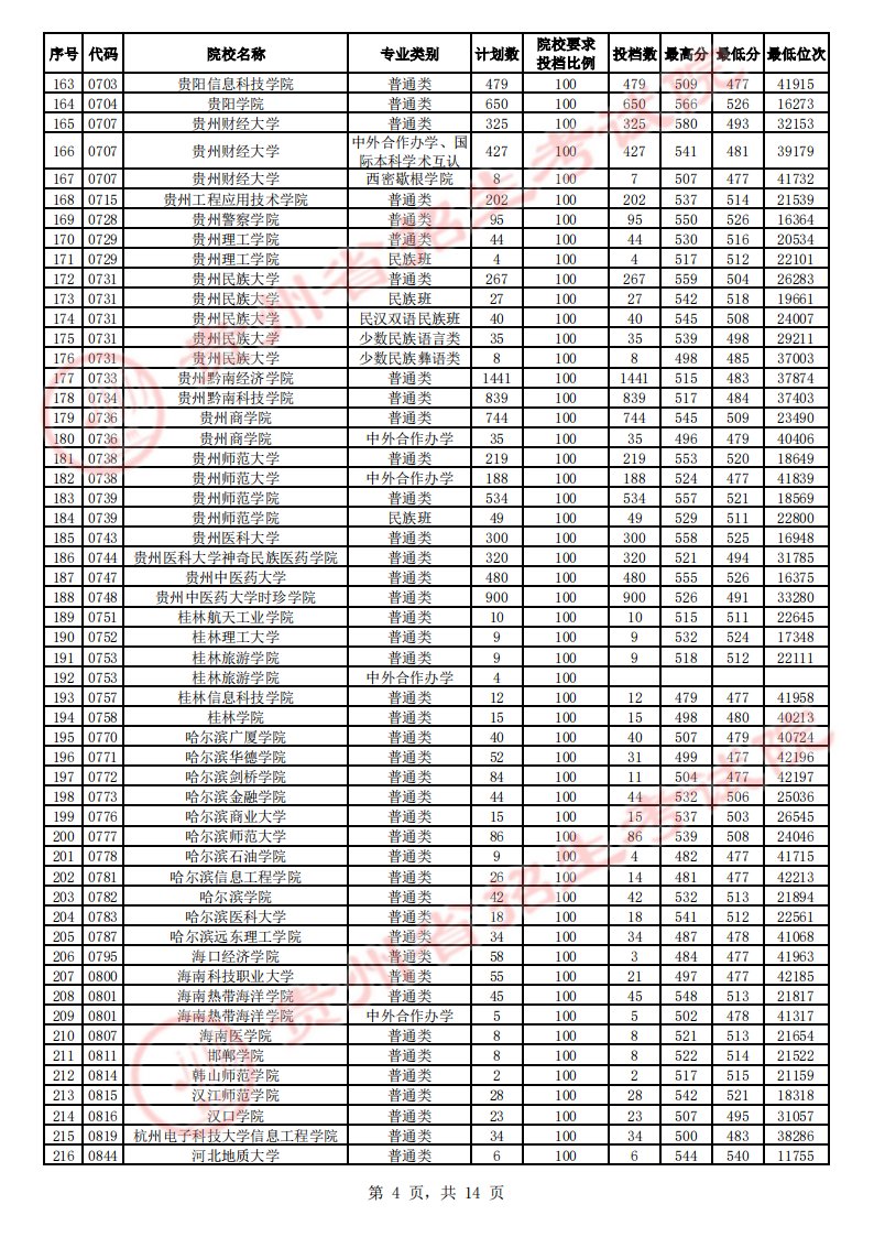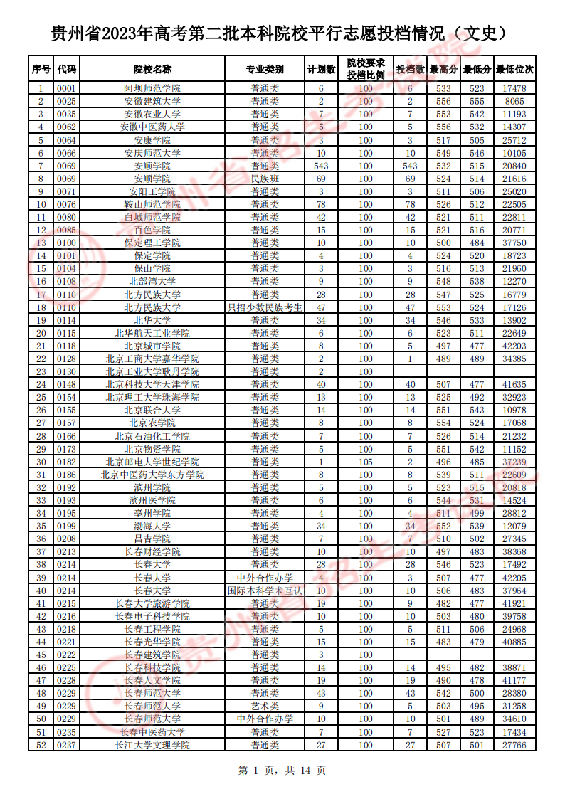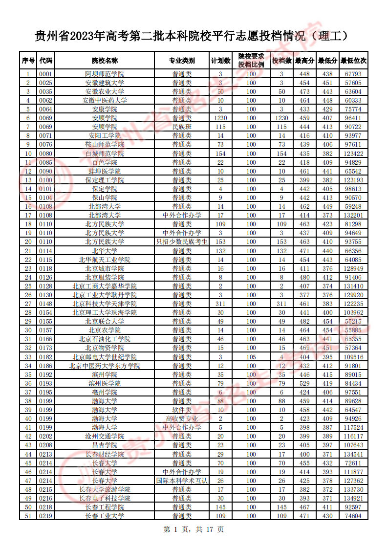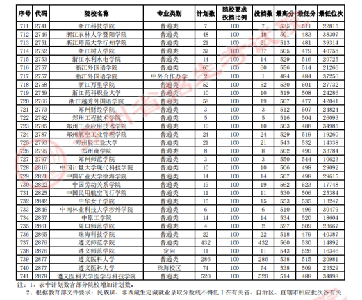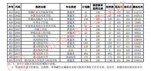 贵州高考二本院校第2次征集志愿平行投档情况