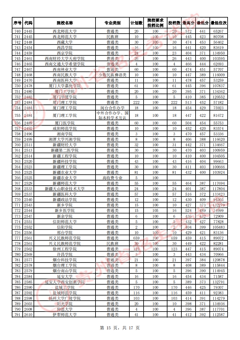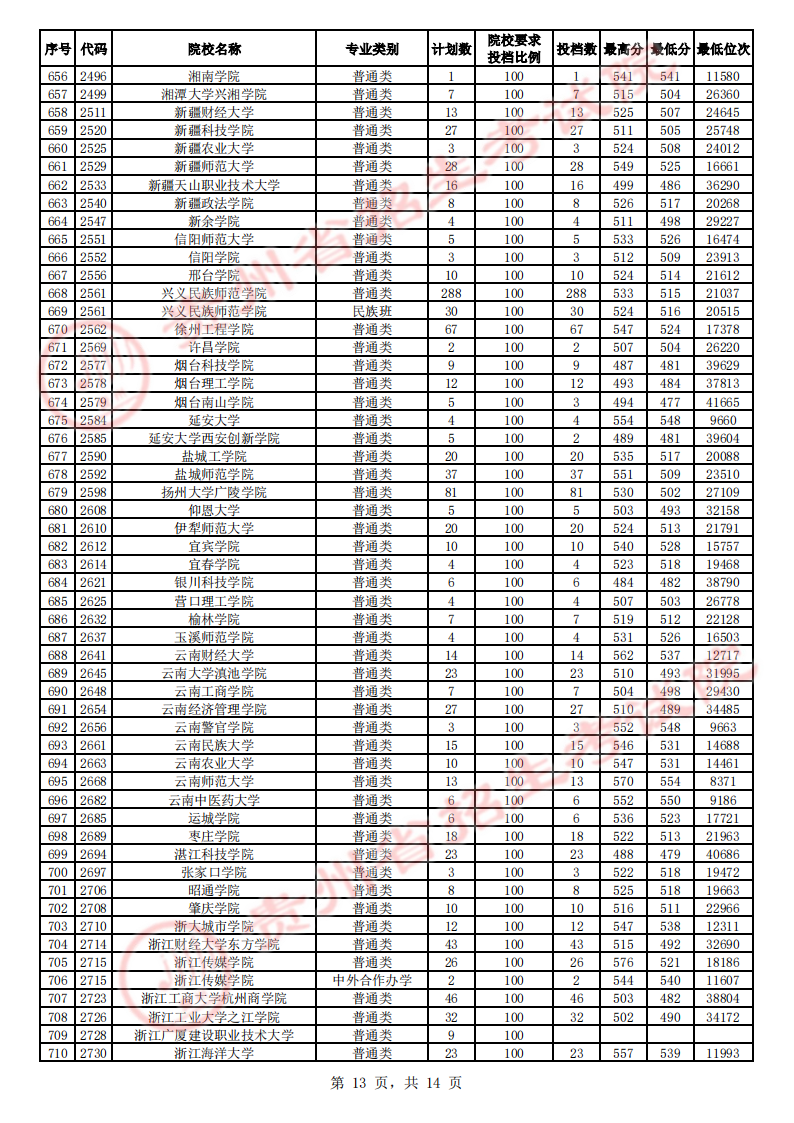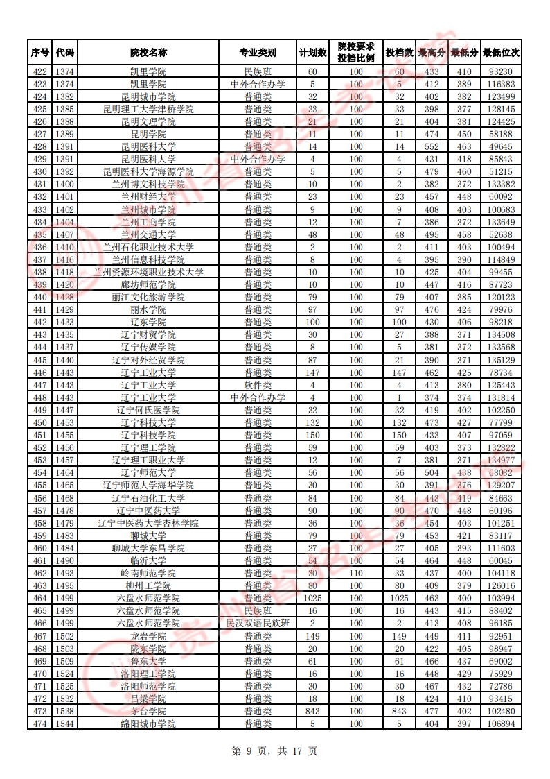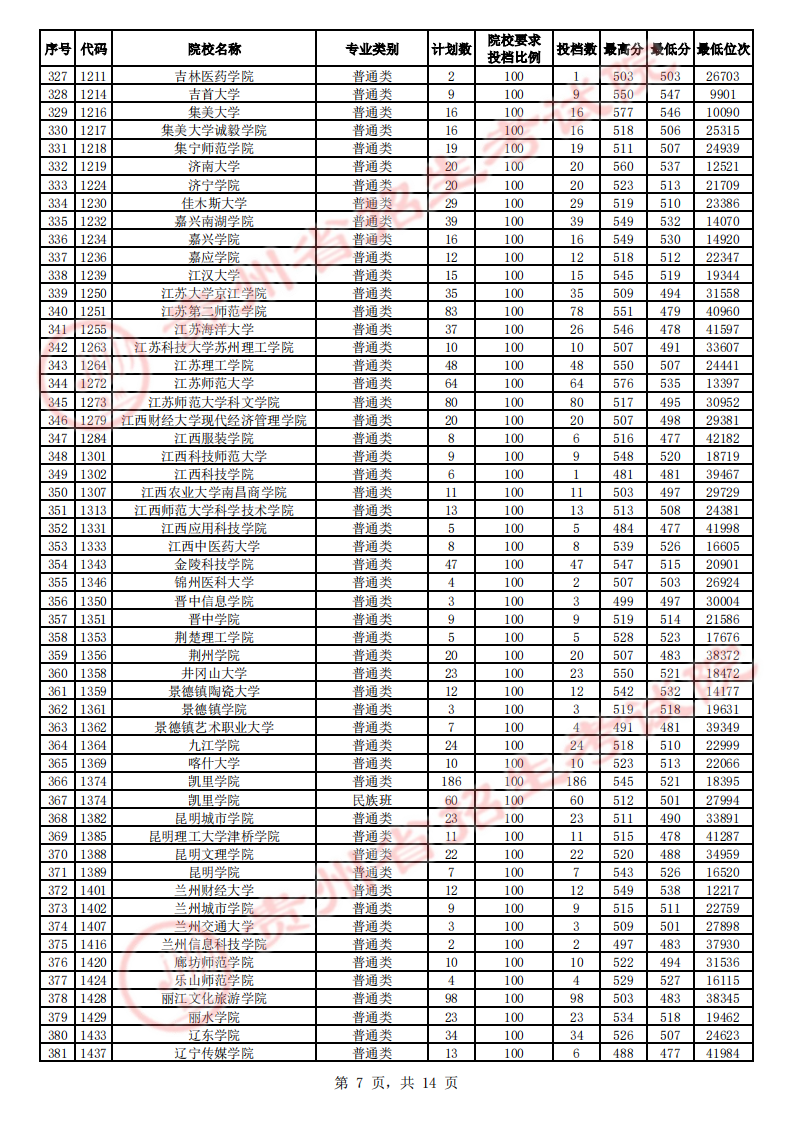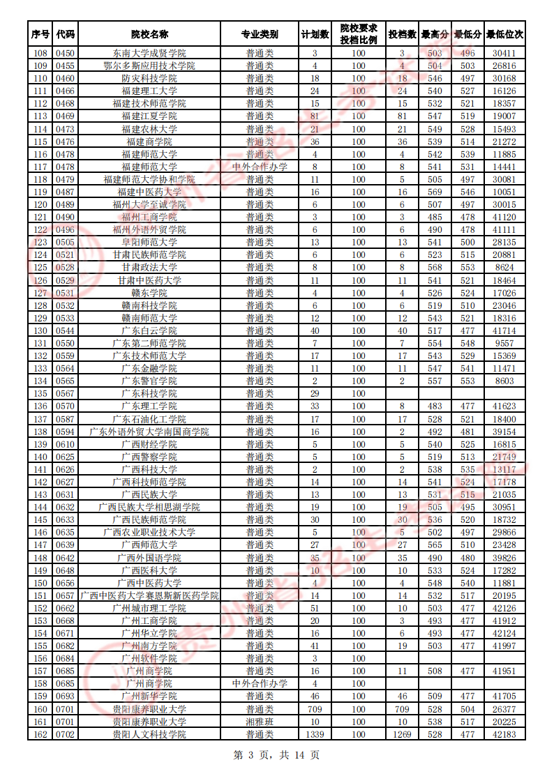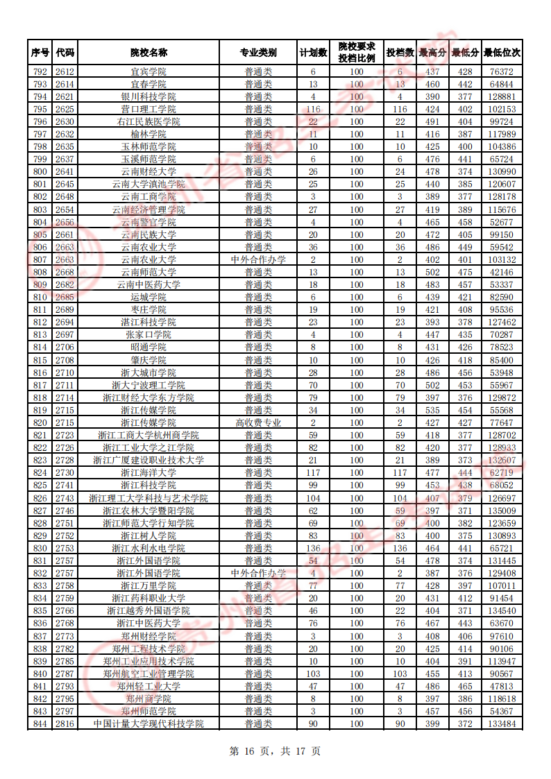 贵州高考二本院校第2次征集志愿平行投档情况