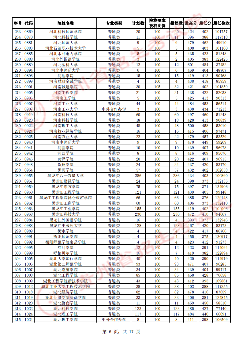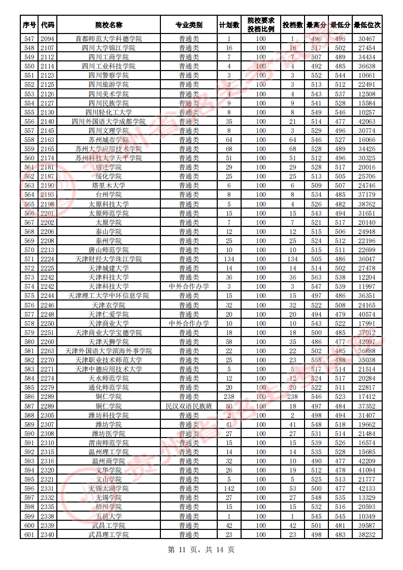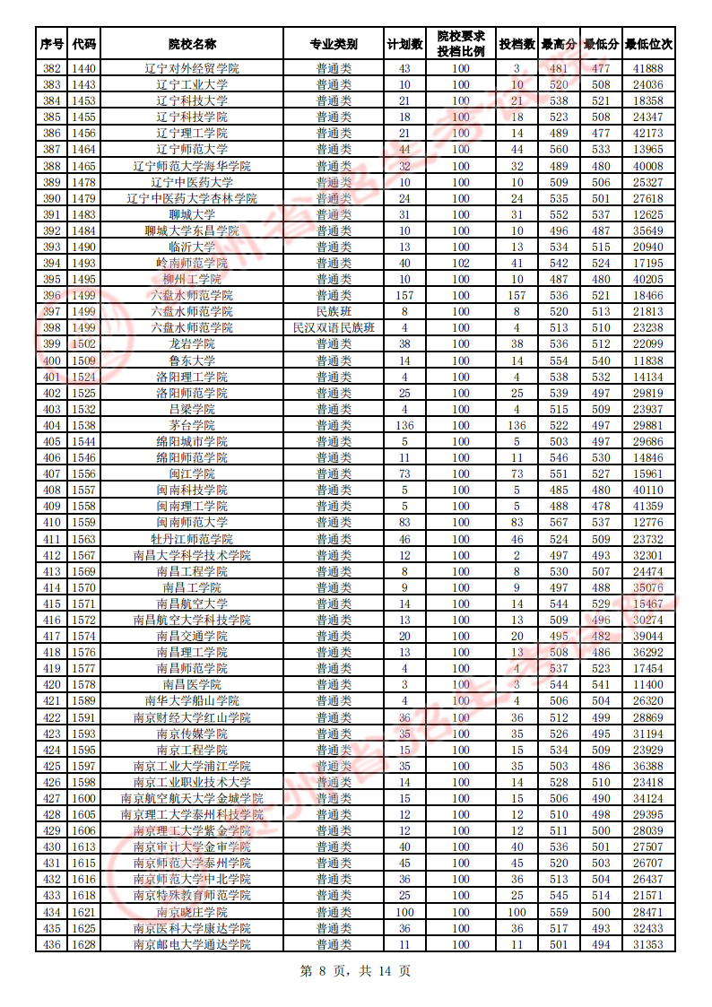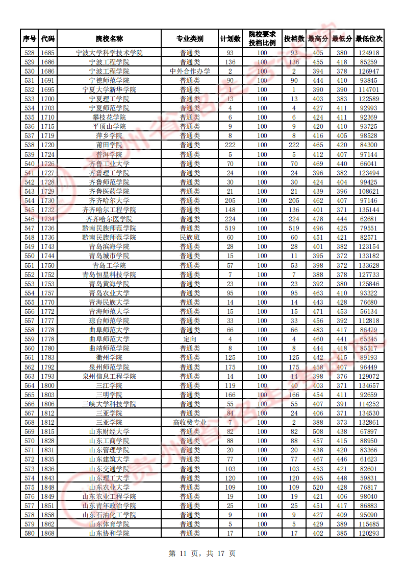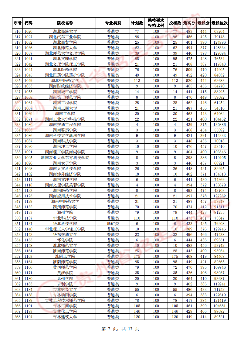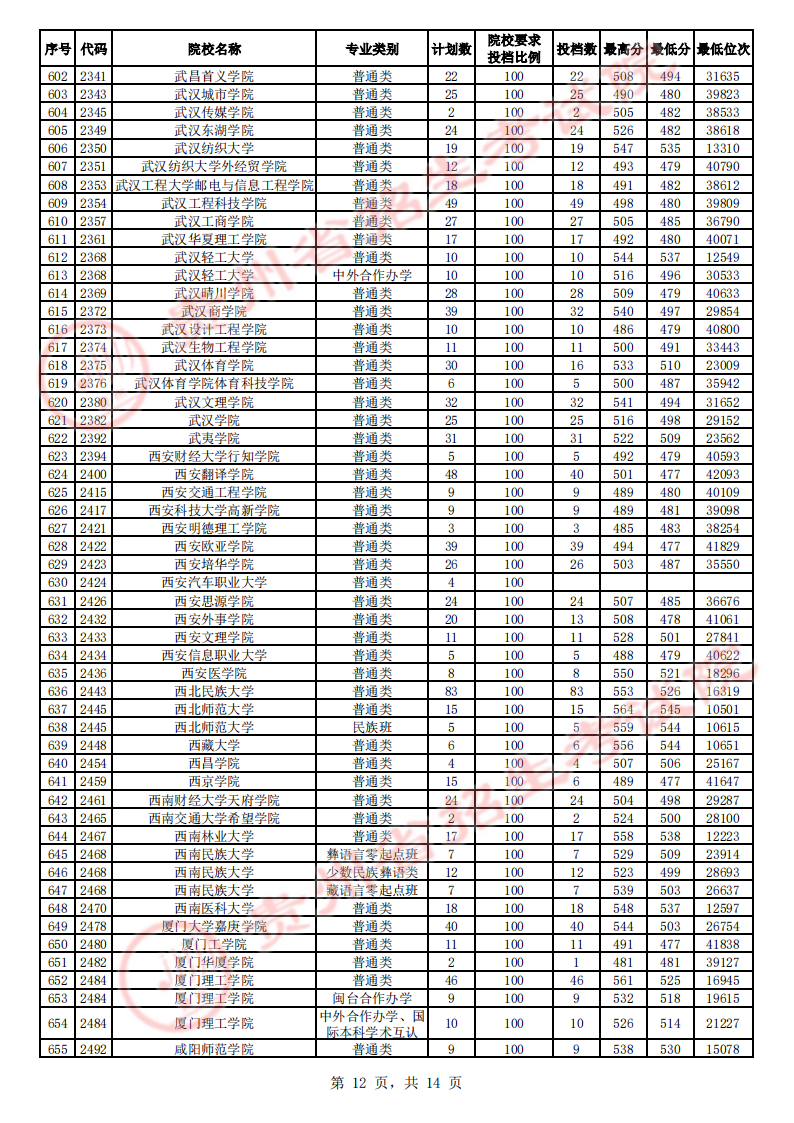 贵州高考二本院校第2次征集志愿平行投档情况