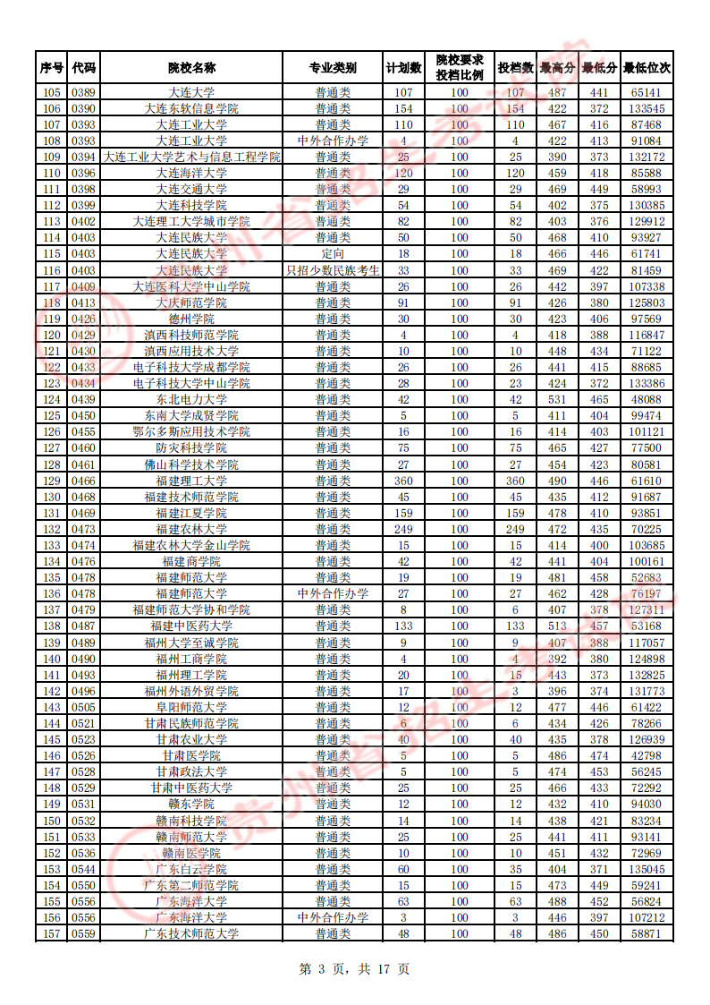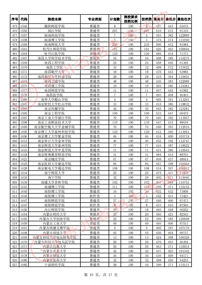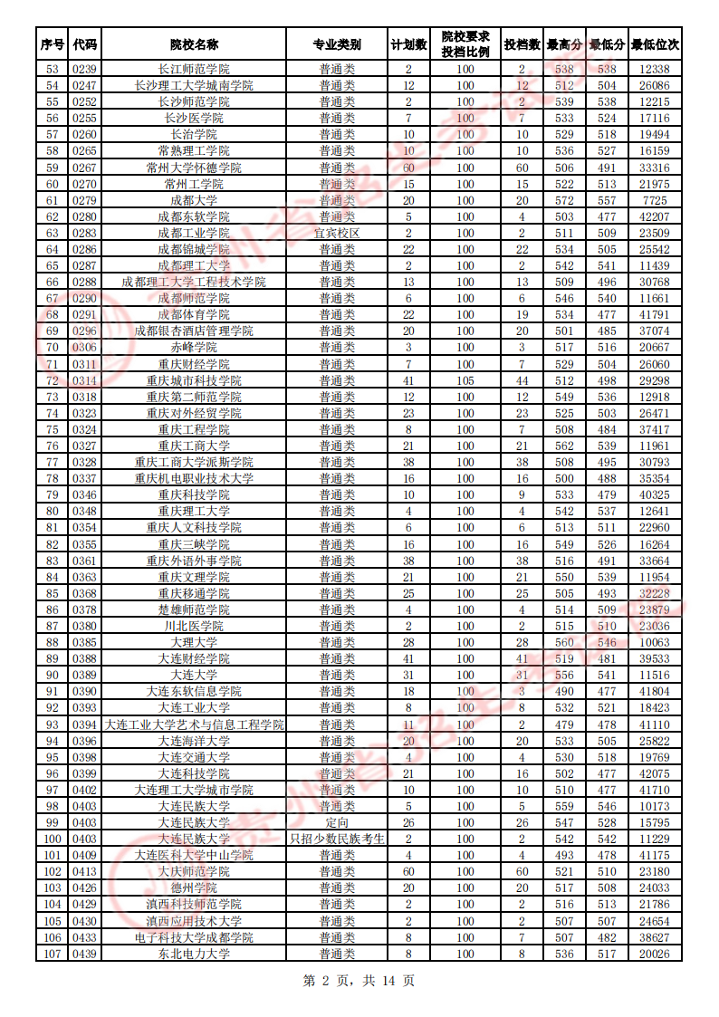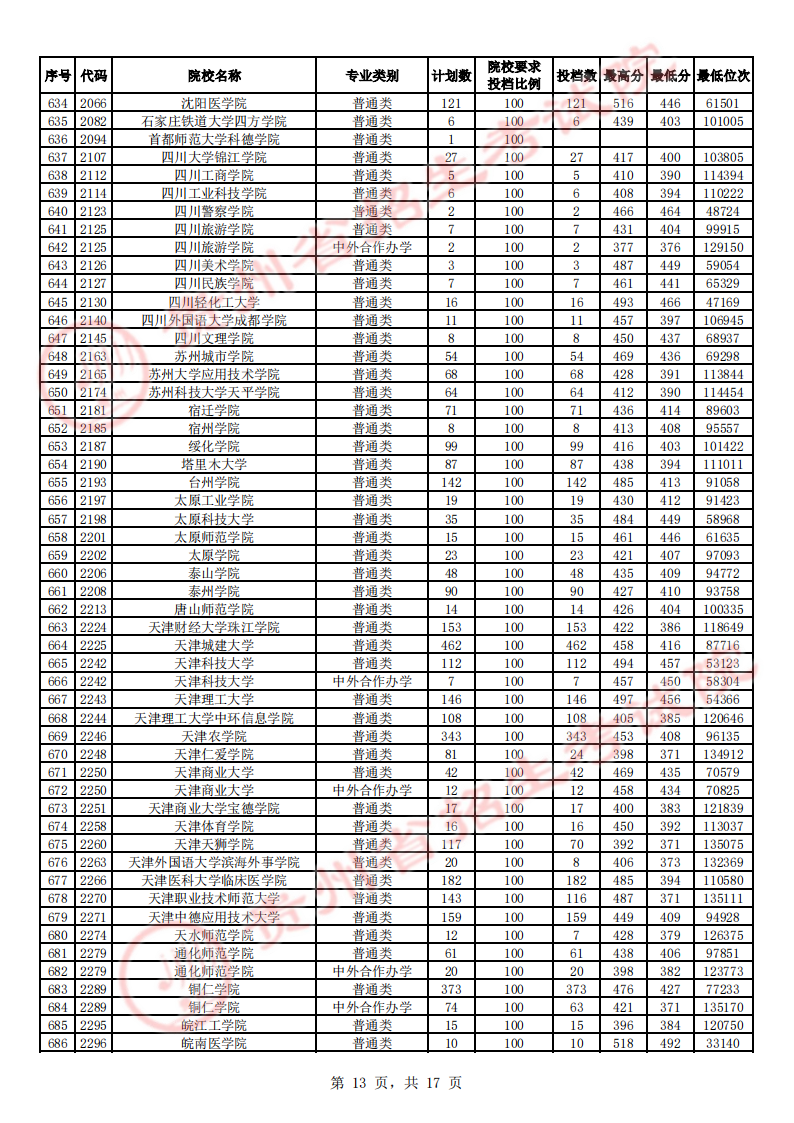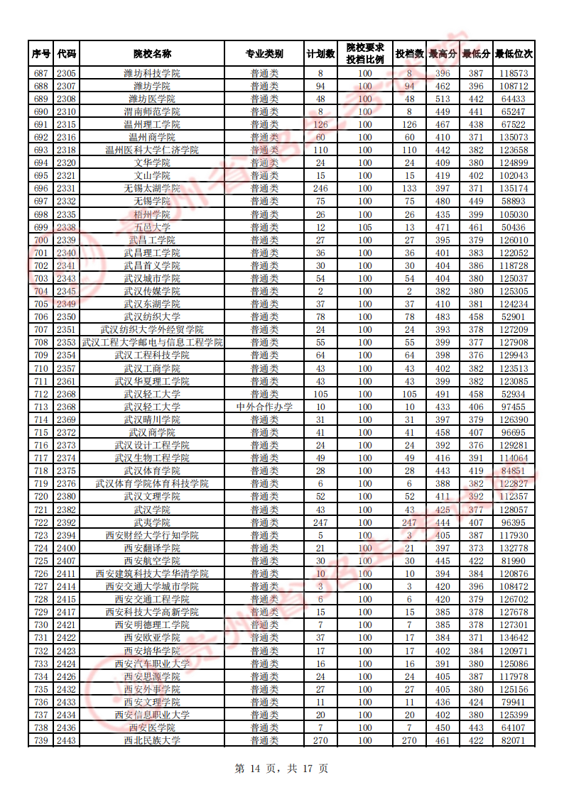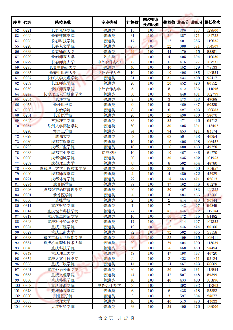 贵州高考二本院校第2次征集志愿平行投档情况