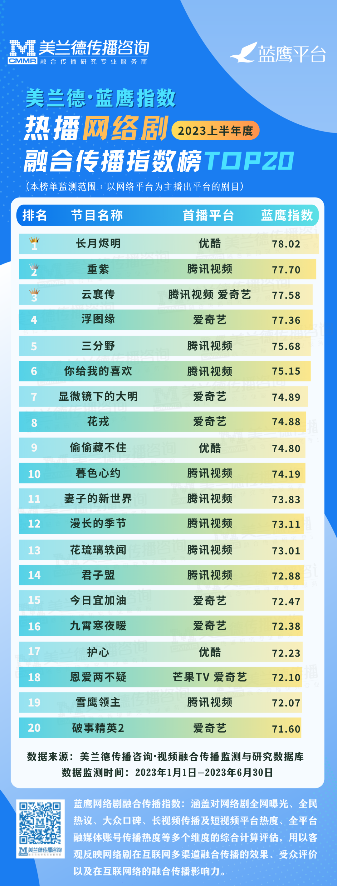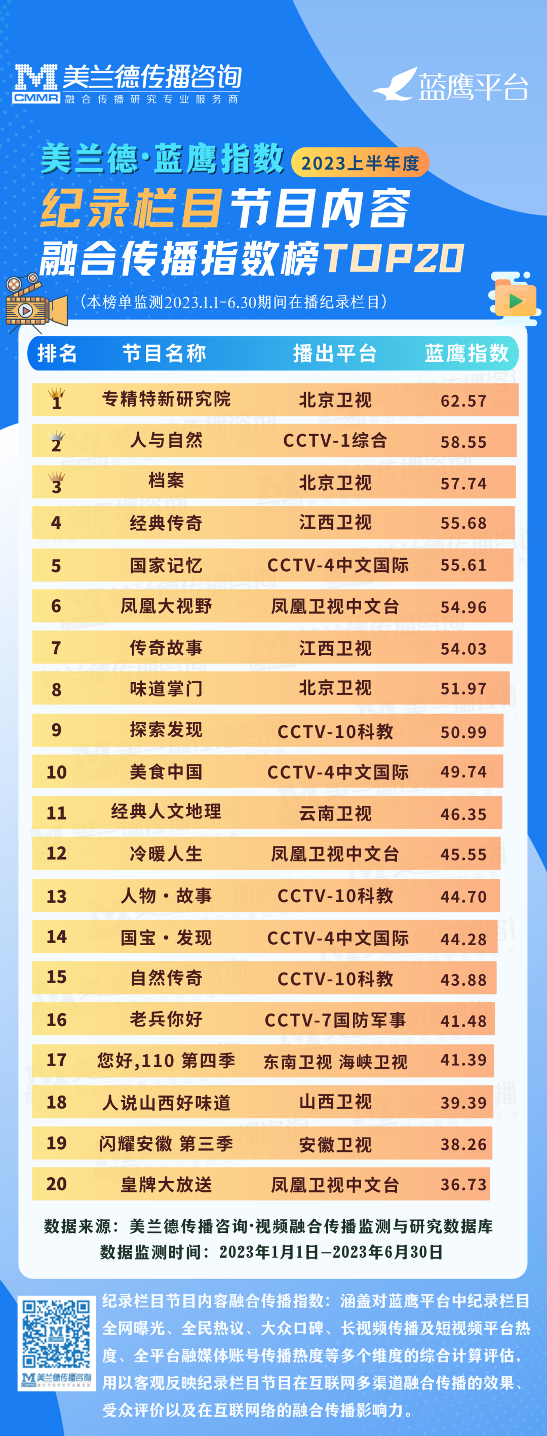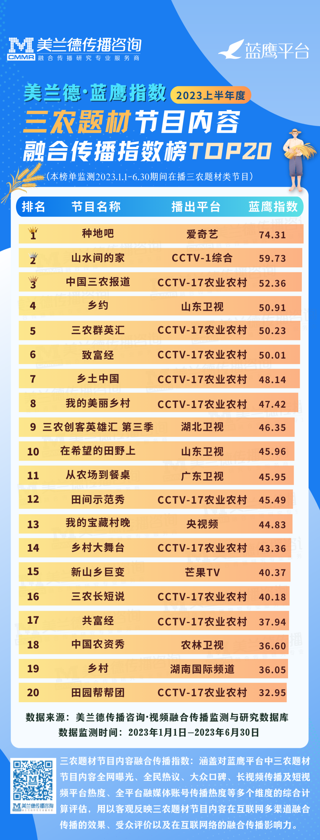 在此次推出的2023上半年影视节目、省级广电机构融媒账号系列榜单中,我们将目光投向了多个领域,不仅呈现了剧集、综艺、纪录片市场的优秀节目IP,还聚焦文化、三农、少儿、大健康等垂类领域,并对省级广电全平台融媒账号运营与传播状况进行全面监测与分析。也希望能够借助对优秀节目、融媒账号的深度挖掘,助力行业持续创新前行!
