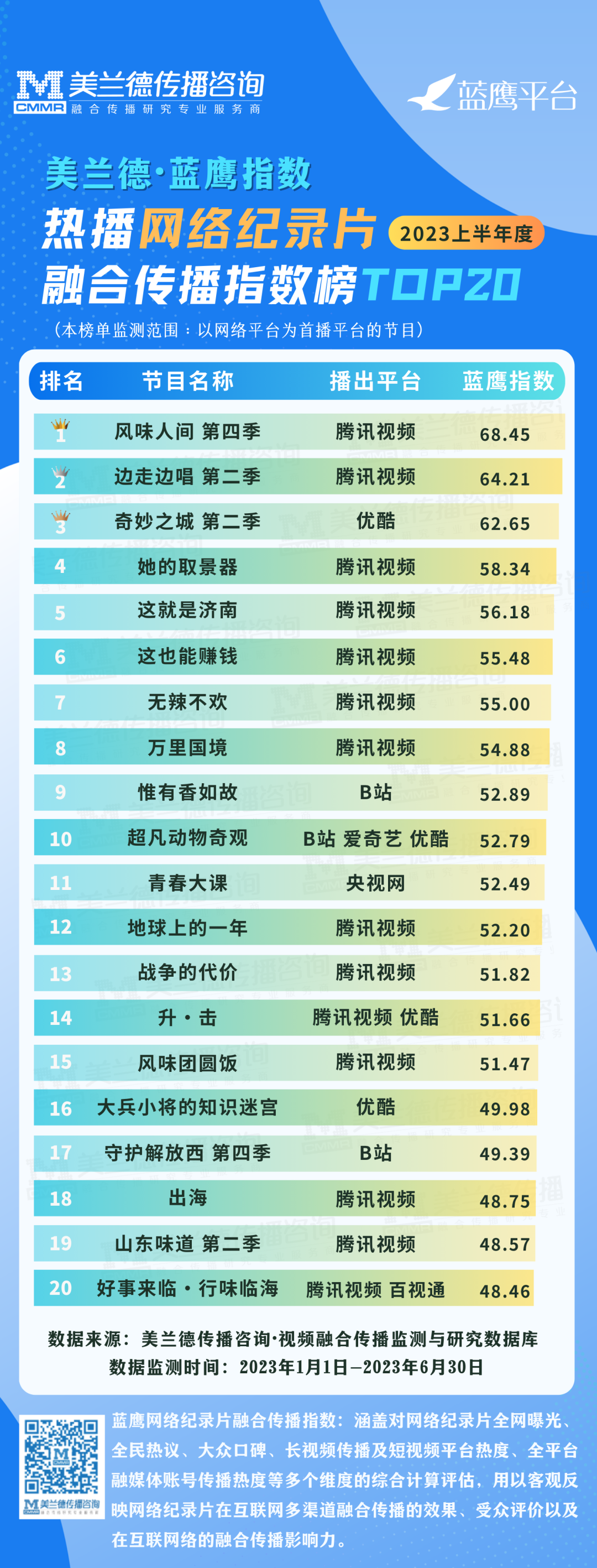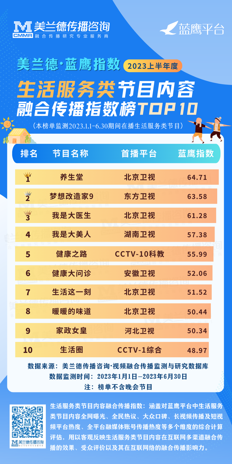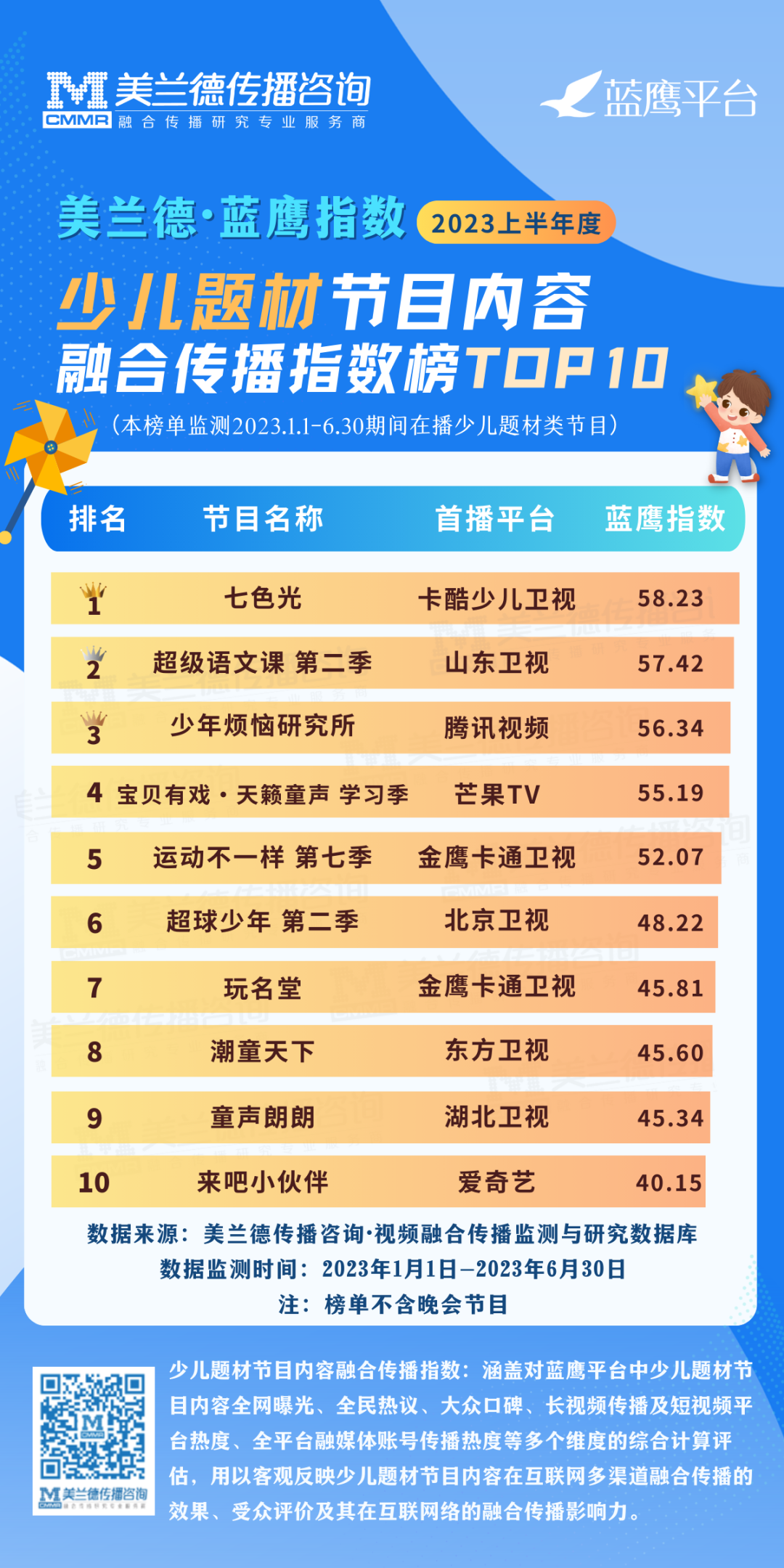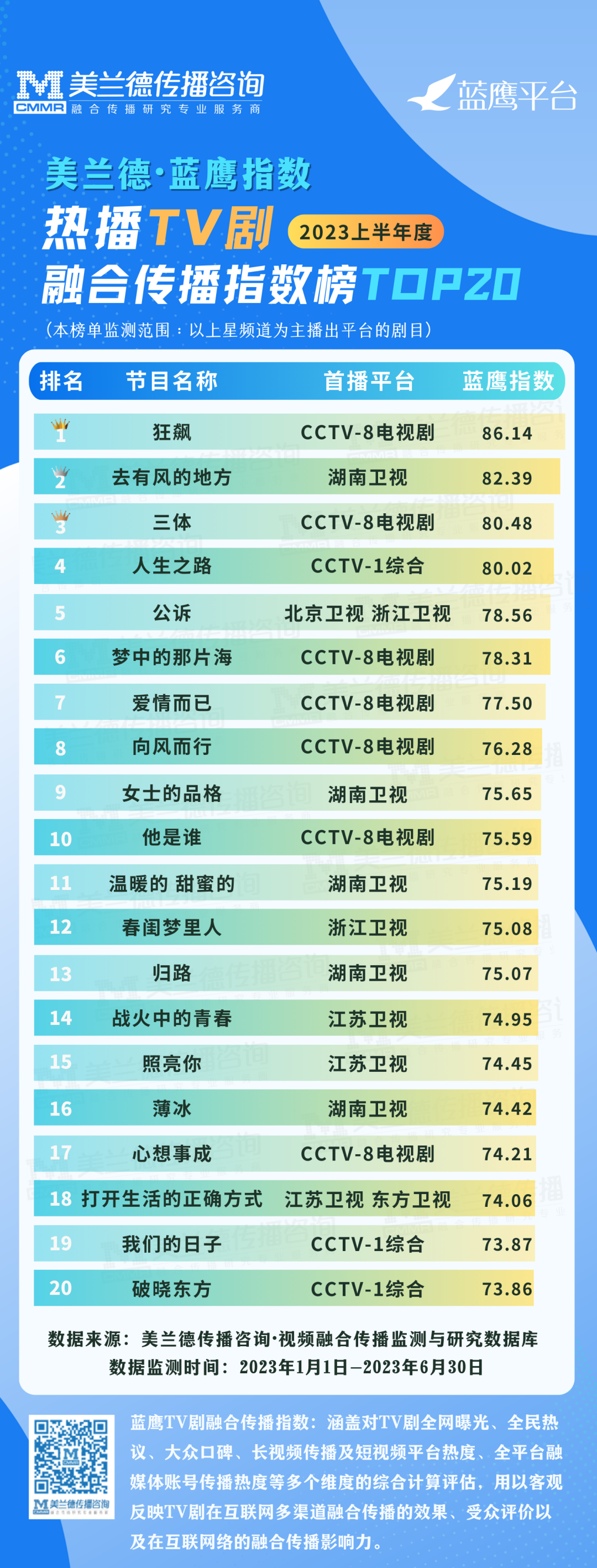 在此次推出的2023上半年影视节目、省级广电机构融媒账号系列榜单中,我们将目光投向了多个领域,不仅呈现了剧集、综艺、纪录片市场的优秀节目IP,还聚焦文化、三农、少儿、大健康等垂类领域,并对省级广电全平台融媒账号运营与传播状况进行全面监测与分析。也希望能够借助对优秀节目、融媒账号的深度挖掘,助力行业持续创新前行!