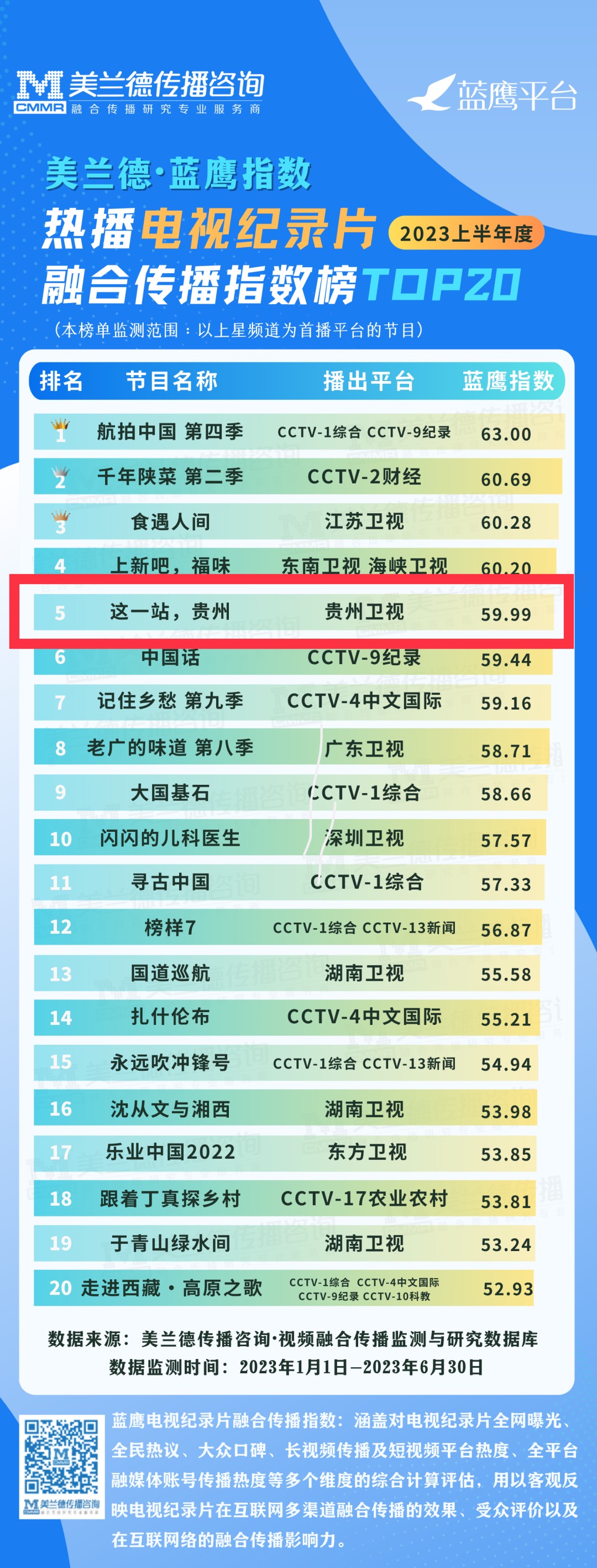 7月18日,美兰德2023上半年多类型节目融合传播指数榜单发布,贵州卫视《这一站,贵州》在2023年上半年“热播电视纪录片融合传播指数榜”TOP20中名列第五位。