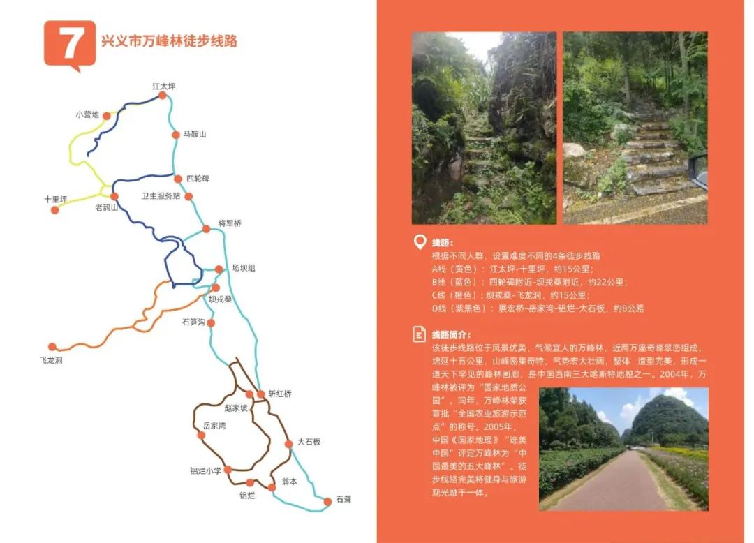 兴义市万峰林,因其独特的地形地貌和丰富的自然景观,成为了徒步爱好者的天堂。这里的徒步线路穿越了壮观的峰林、清澈的河流和茂密的森林,为徒步者提供了无比美好的视觉享受和独特的户外体验。