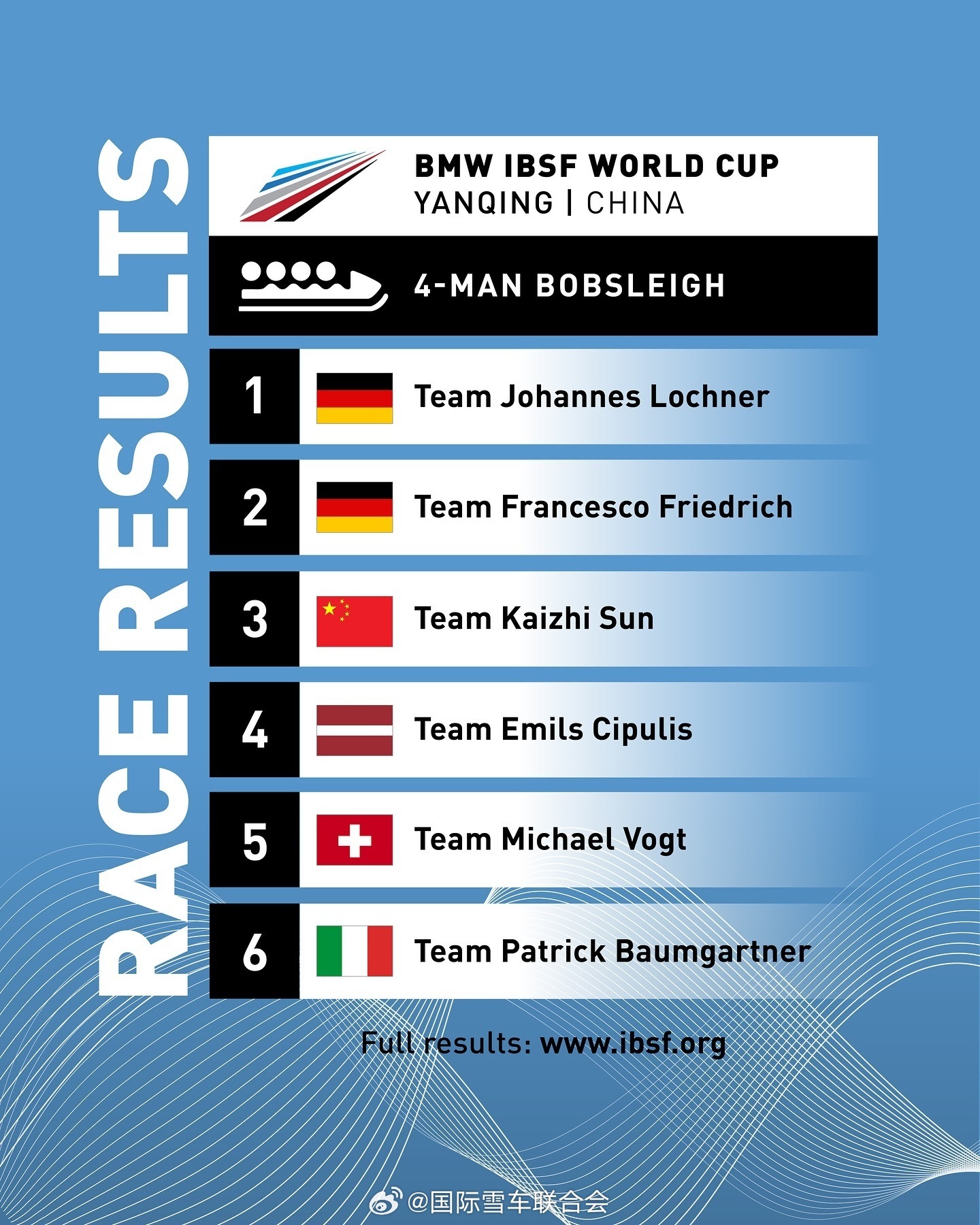 18日,在国际雪车联合会雪车和钢架雪车世界杯北京延庆站比赛中,由孙楷智、甄恒、丁嵩、叶杰龙组成的中国队在四人雪车第一次比赛中收获铜牌,创造中国队在该项目的世界杯最好成绩。中国组合第一轮滑出58秒58的好成绩,位列第一位。第二轮,中国队最后一位出发,成绩为58秒86,两轮滑行总成绩1分57秒44排名第三,中国组合最终收获一枚铜牌。这也是中国男子雪车获得的首枚世界杯奖牌。另一组中国选手李纯键、魏鹏、朱自龙和匙翔宇获得第七名。德国组合包揽冠亚军。