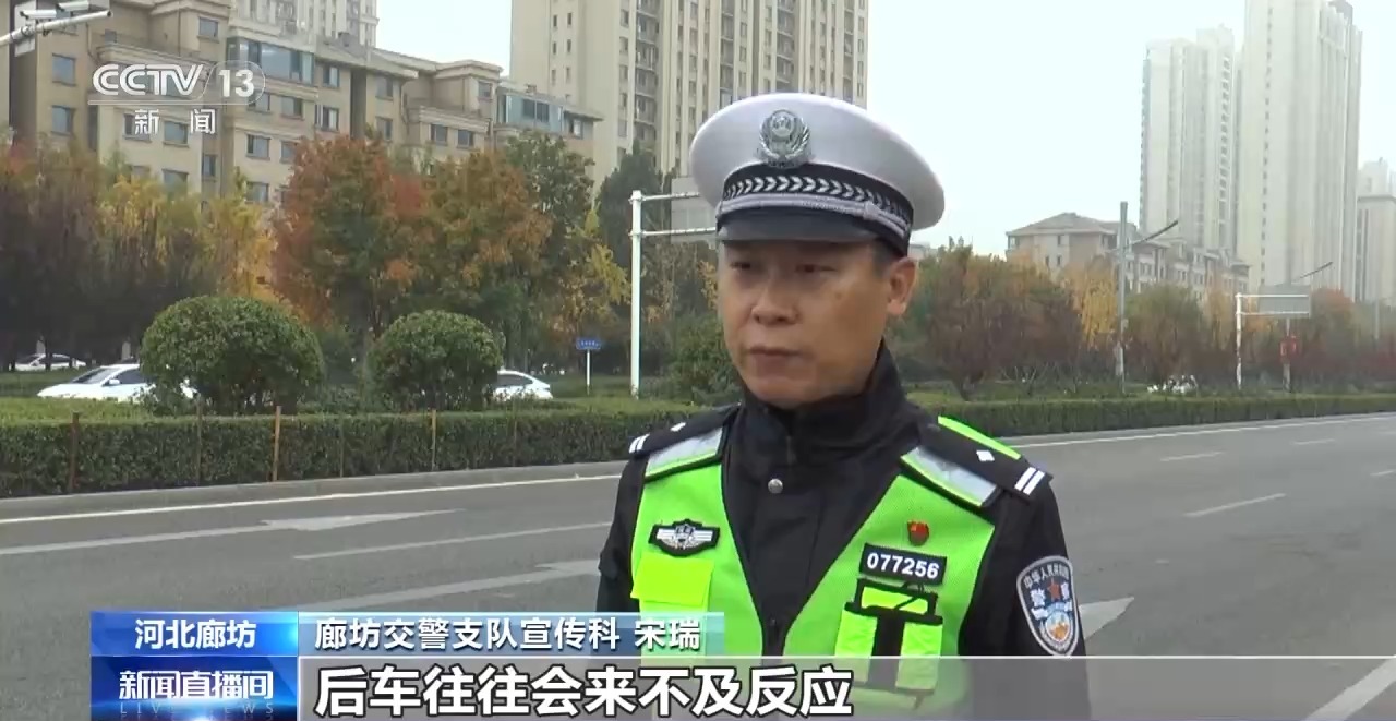 廊坊交警支队宣传科 宋瑞:雾天能见度低,如果车与车之间距离过近,当前方车辆突发意外情况的时候,后车往往会来不及反应被殃及或者造成追尾事故。