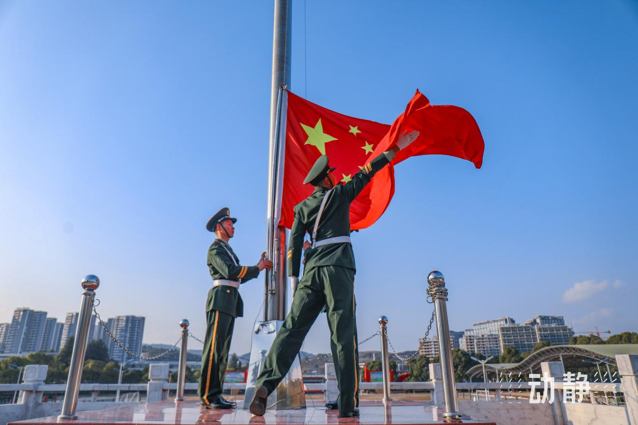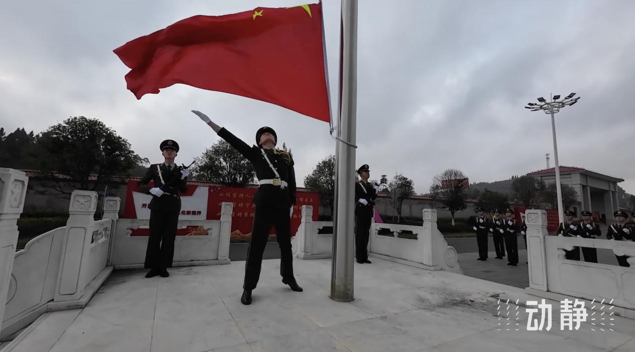 在武警贵州总队黔西南支队升旗仪式现场,31人组成的方队护卫着鲜艳的五星红旗,昂首阔步走向国旗杆下。升旗手迎风振臂,五星红旗迎风飘扬。