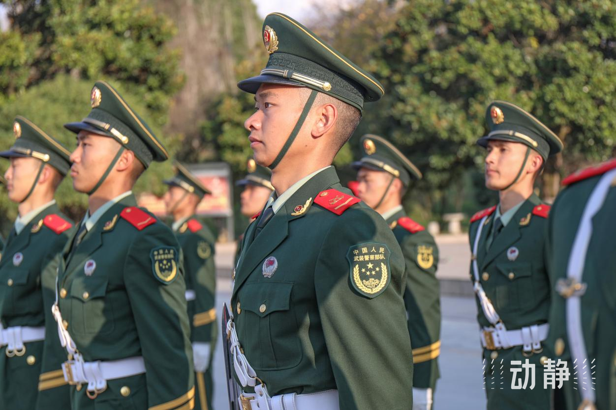 武警贵州总队机动支队护旗方队官兵军容严整,英姿飒爽,迈着有力的步伐护卫国旗向旗台迈进,伴随着雄壮的国歌,鲜艳的五星红旗冉冉升起,全体官兵庄严肃立,向国旗敬礼。