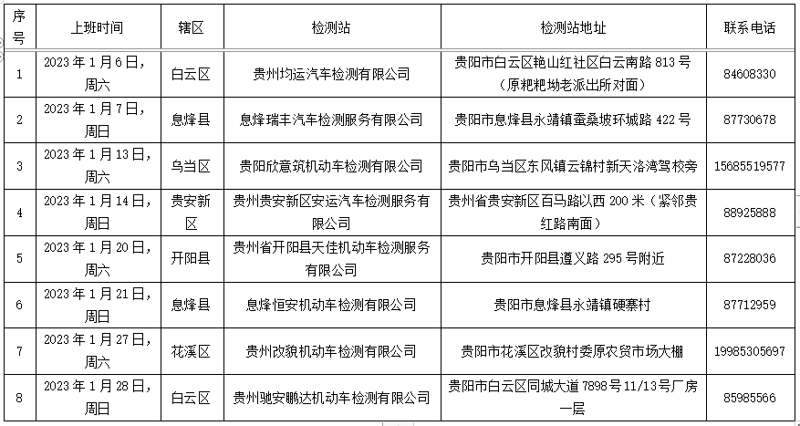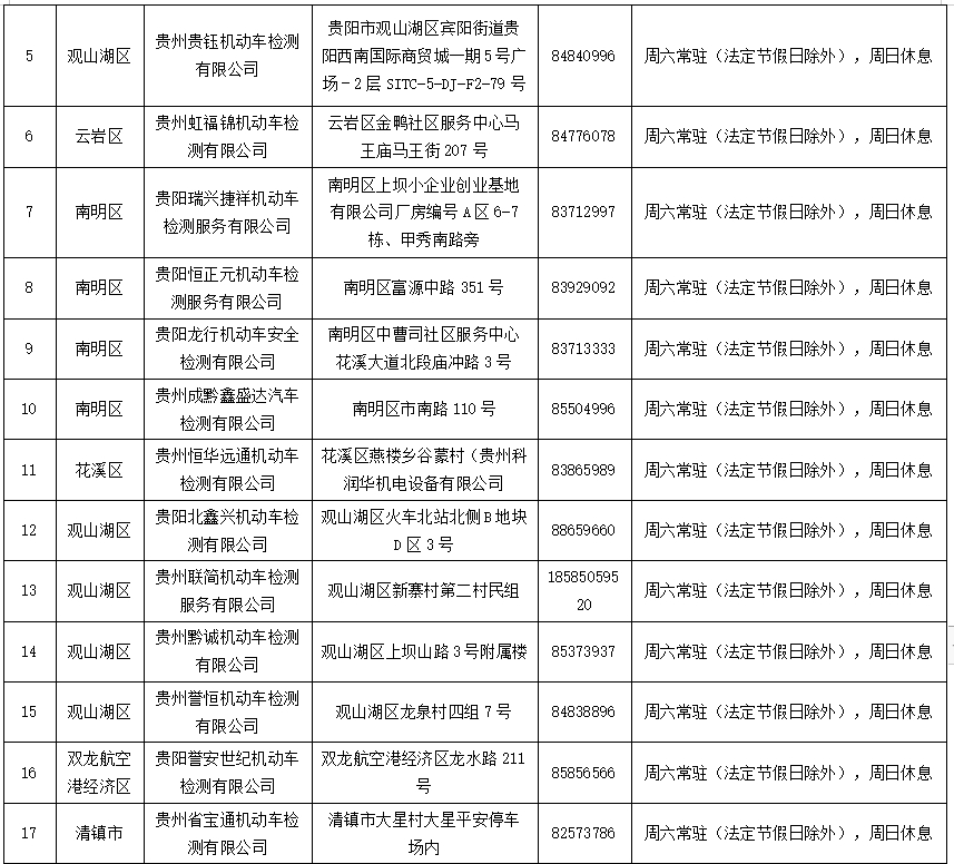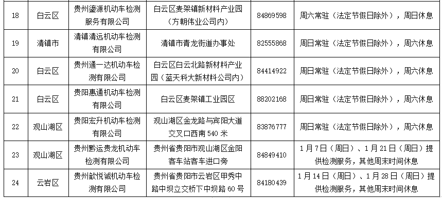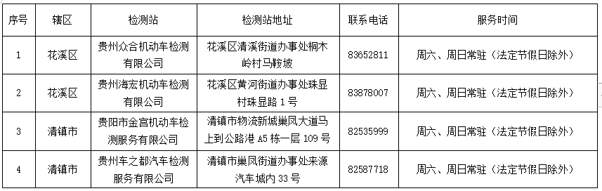 除了上述公布的时间表之外,为最大程度地方便车主办理机动车检验业务,目前贵阳市有24家检测站根据自身情况提供周末检验服务。在公布的上述时间内,车主可根据自身情况另行选择以下检测站服务时间进行检验。