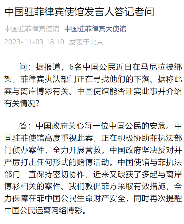 问:据报道,6名中国公民近日在马尼拉被绑架,菲律宾执法部门正在寻找他们的下落。据称此案与离岸博彩有关。中国使馆能否证实此事并介绍有关情况?