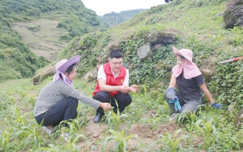 贵州省遵义市在特色农业园区建设中,组织436名乡村振兴村级组织领军人才,包片长效落实种植技术指导、田间管理、营销带货等帮扶责任,大力推动蔬菜、特色水果、茶叶等农产品种植提质增效,助力农民增收。图为该市桐梓县容光镇包片领军人才穆伟(中)在蔬菜示范园区向农民讲解菜玉米栽培管护技术。