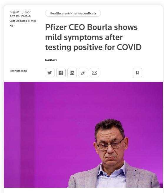 【环球时报综合报道】15日,美国辉瑞公司董事会主席兼首席执行官艾伯乐通过辉瑞官网发表声明,称自己新冠肺炎检测结果呈阳性。艾伯乐称目前自己的症状“非常轻微”,正进行隔离,并已开始服用辉瑞研发的Paxlovid新冠口服药。艾伯乐还透露,他此前已接种4剂辉瑞新冠疫苗。艾伯乐相信自己很快就会痊愈,还借此机会感谢辉瑞同事为研发新冠疫苗和治疗方案所做的努力。2020年,辉瑞和BioNTech合作研发出mRNA新冠疫苗。去年年底,辉瑞研发的Paxlovid成为首个获得美国食品药品监督管理局批准的口服新冠药。