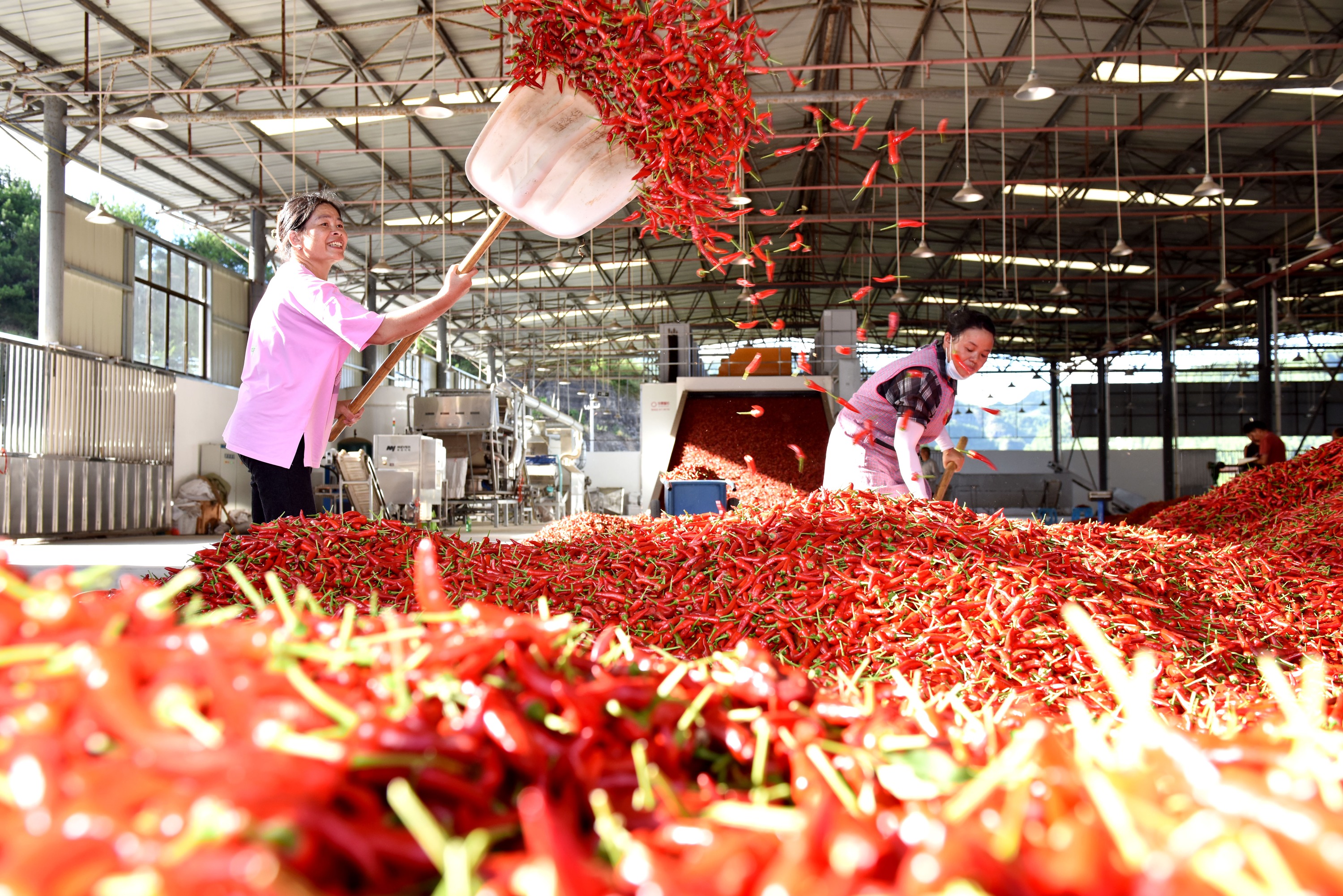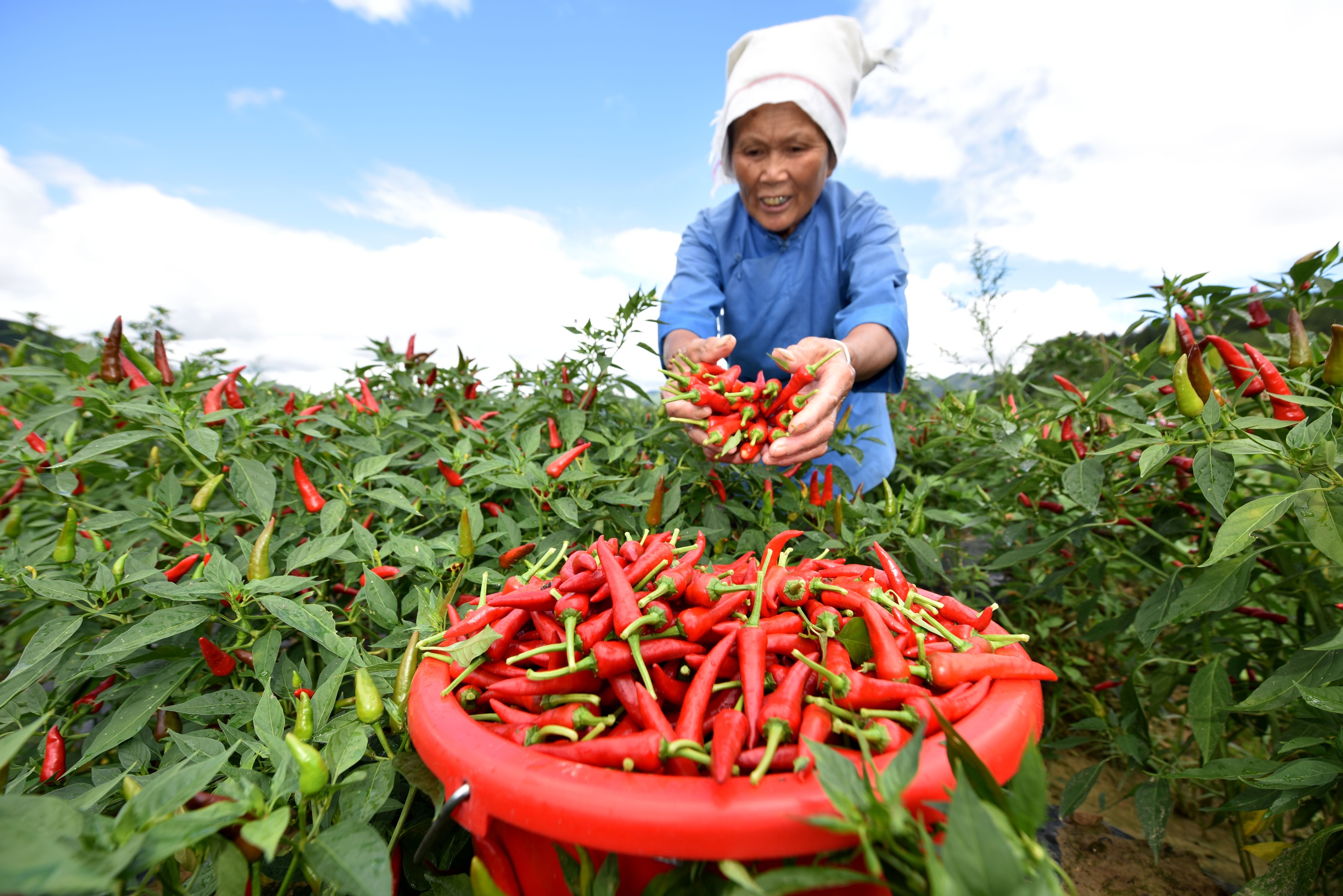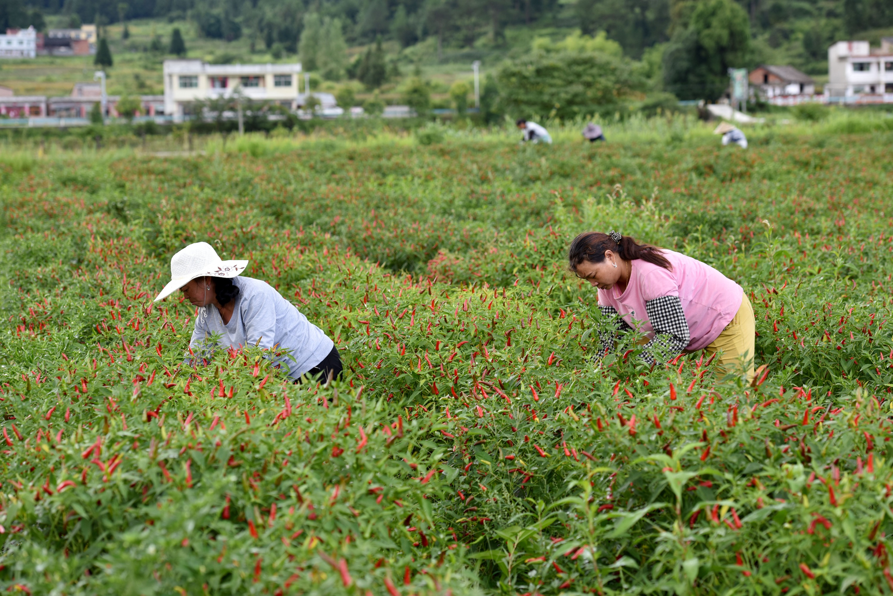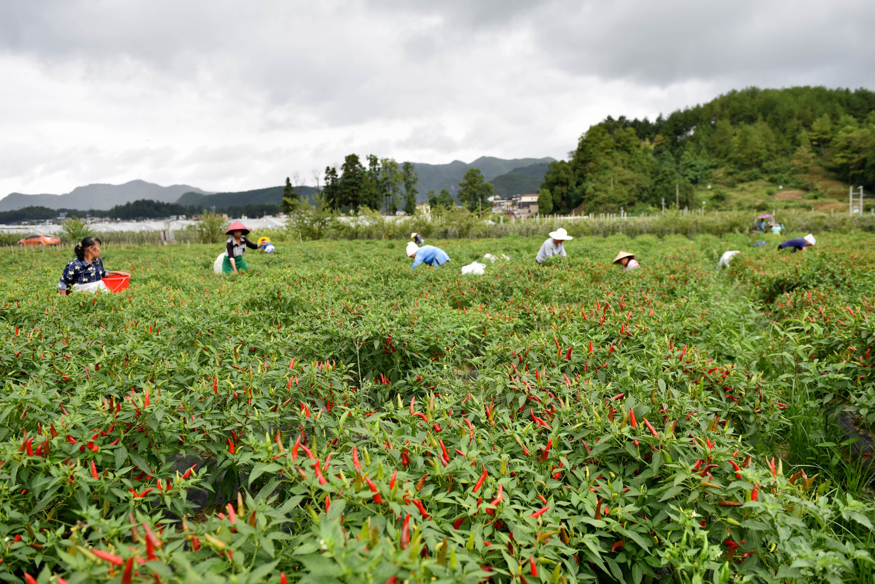 立秋过后,贵州省黔南布依族苗族自治州龙里县湾滩河镇辣椒迎来采摘季,当地群众忙着采摘、搬运、分装辣椒,运往镇内的辣椒加工厂进行烘焙,供应市场。