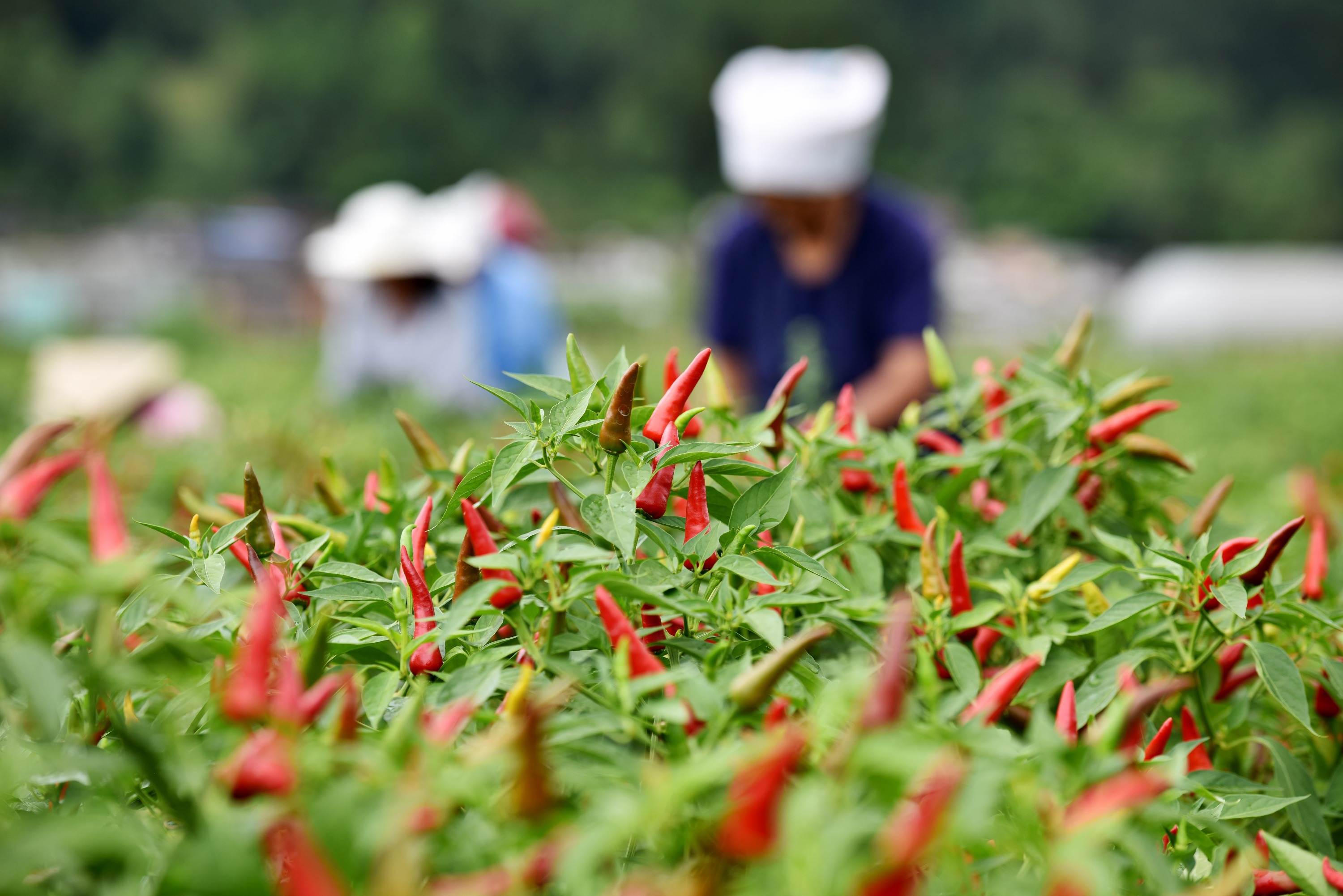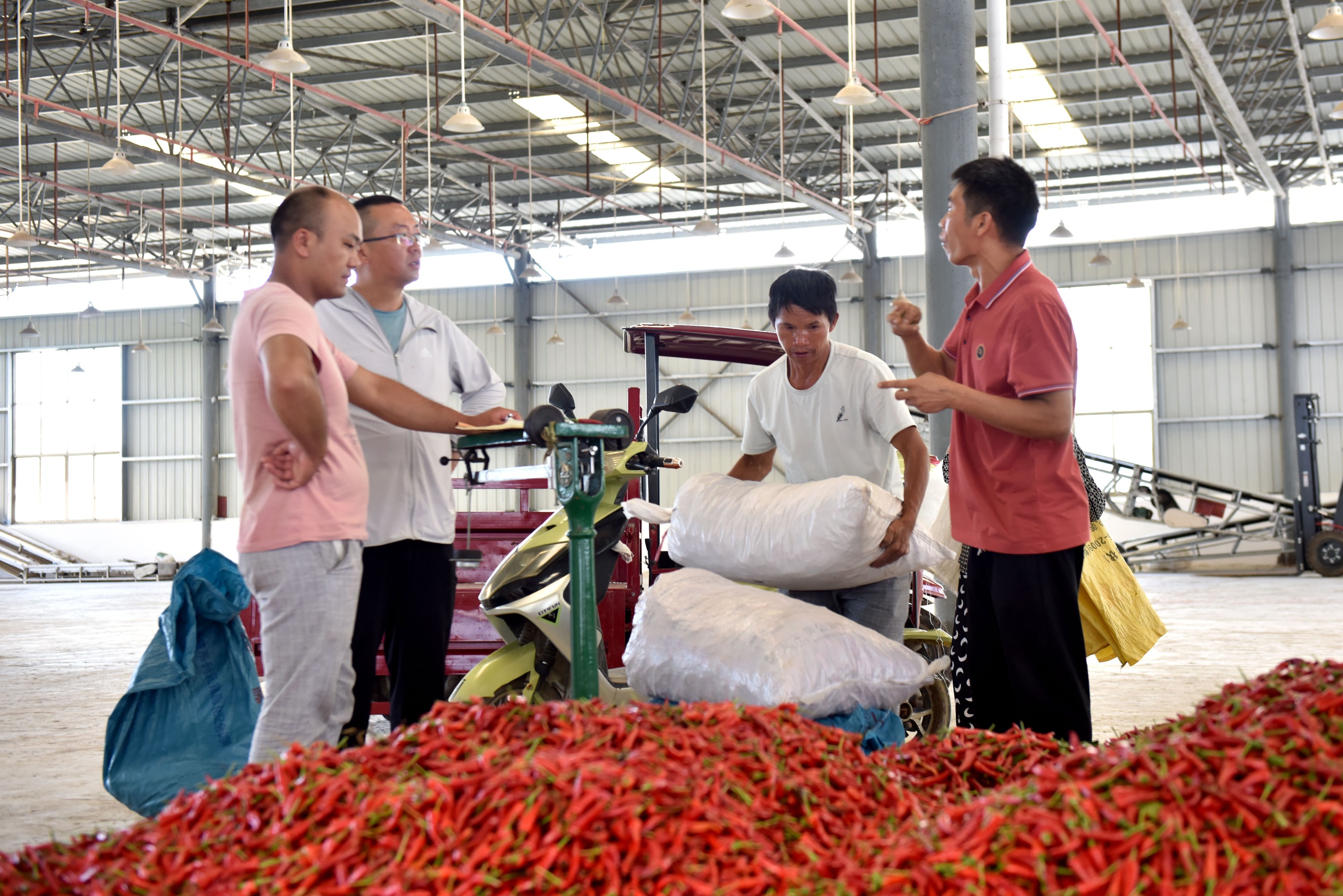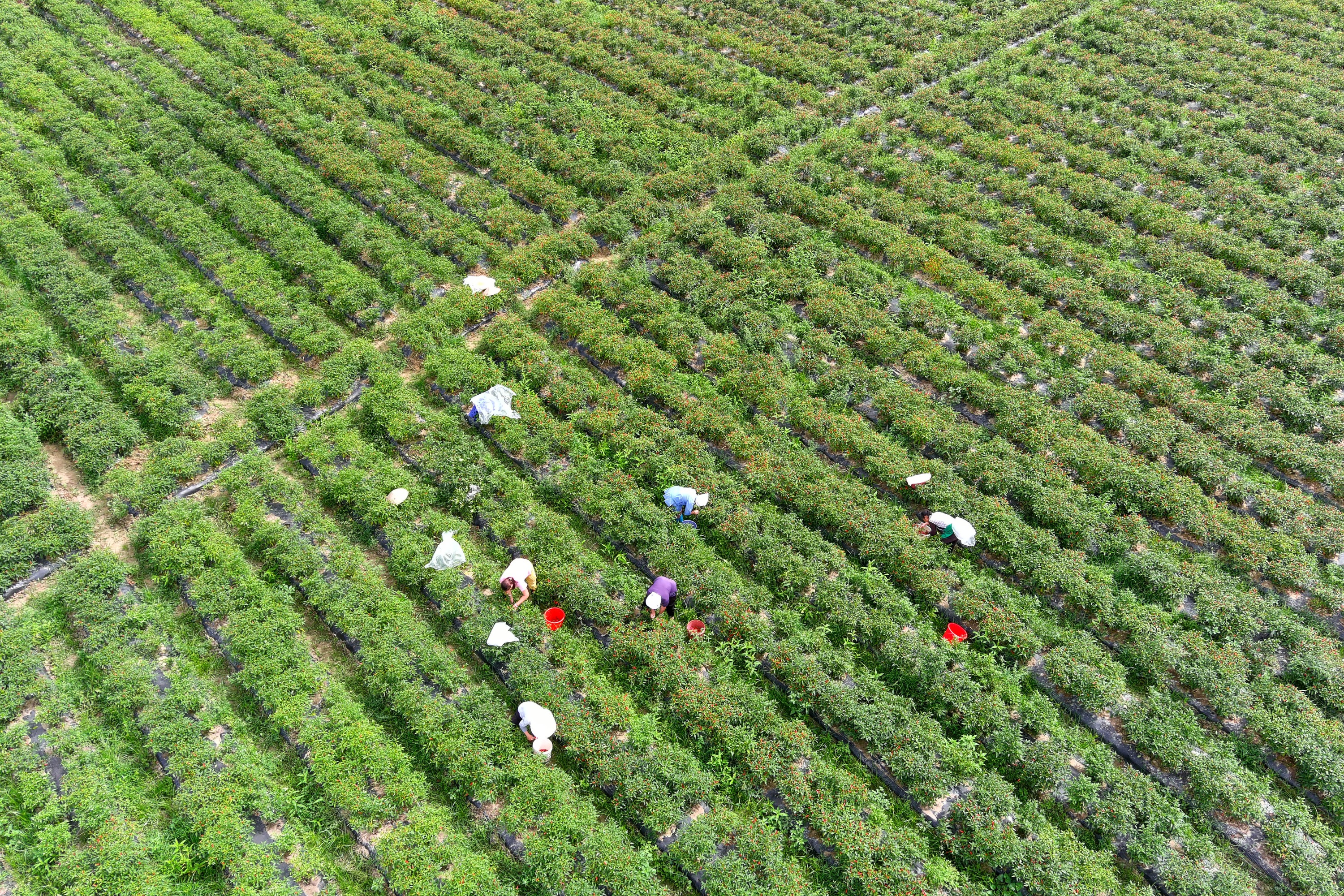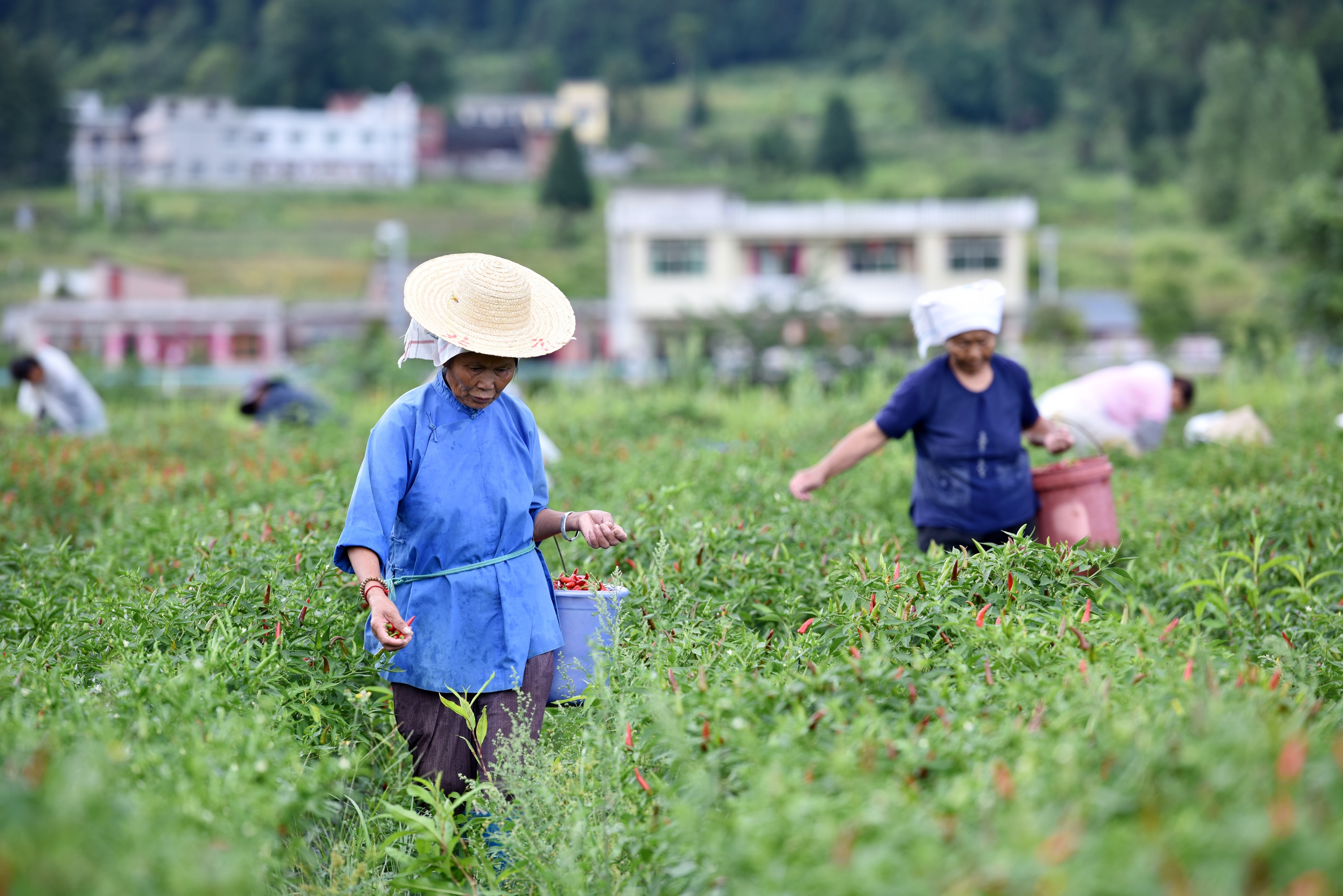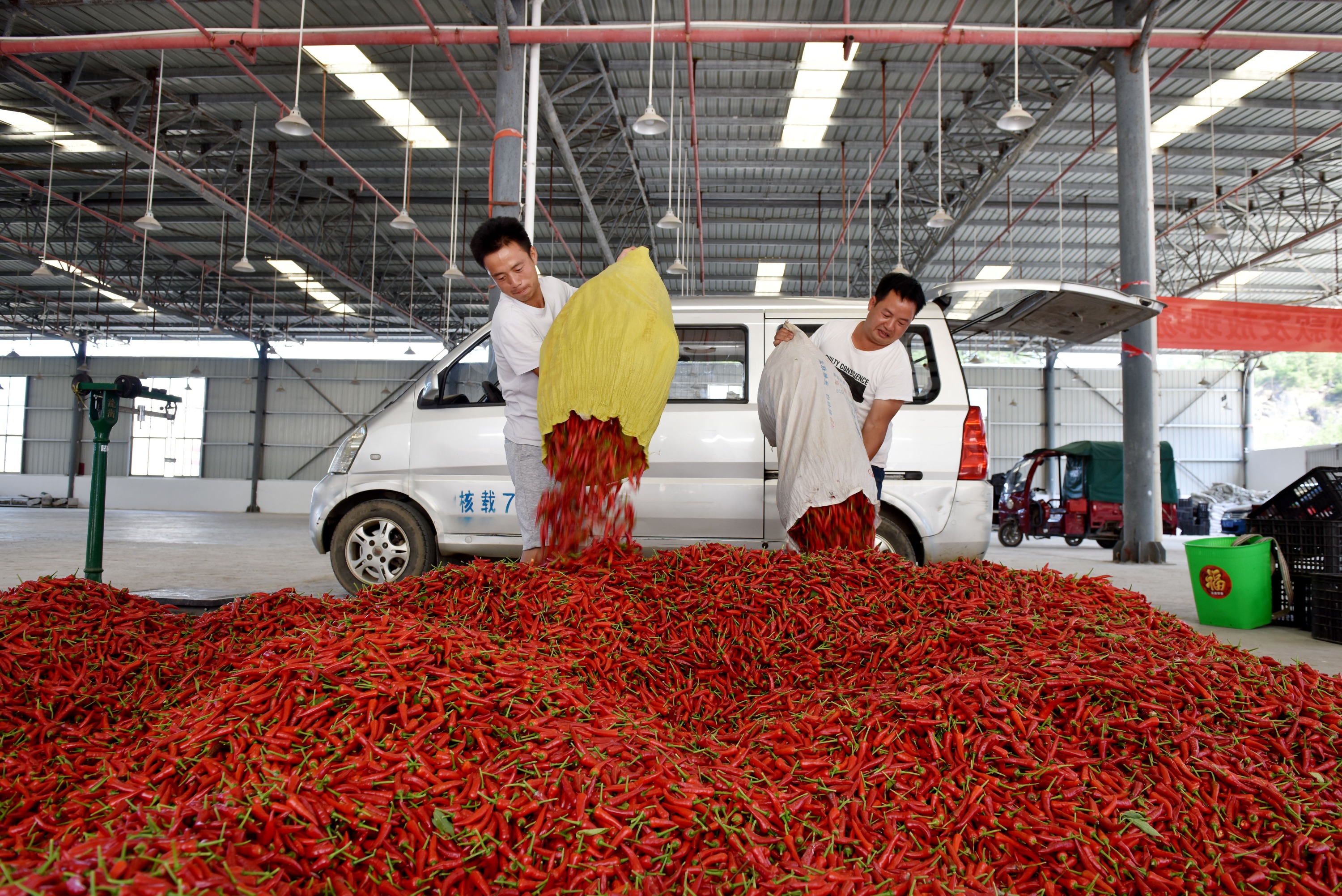 立秋过后,贵州省黔南布依族苗族自治州龙里县湾滩河镇辣椒迎来采摘季,当地群众忙着采摘、搬运、分装辣椒,运往镇内的辣椒加工厂进行烘焙,供应市场。