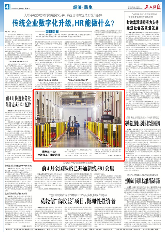 5月18日,《工人日报》刊发《贵州首个5G全连接工厂稳定运行》