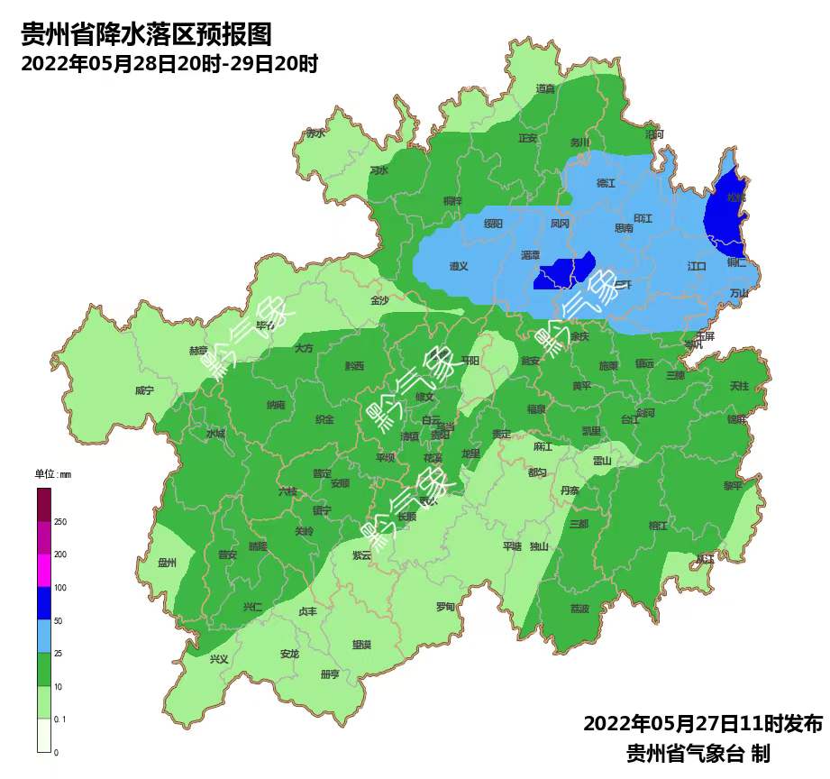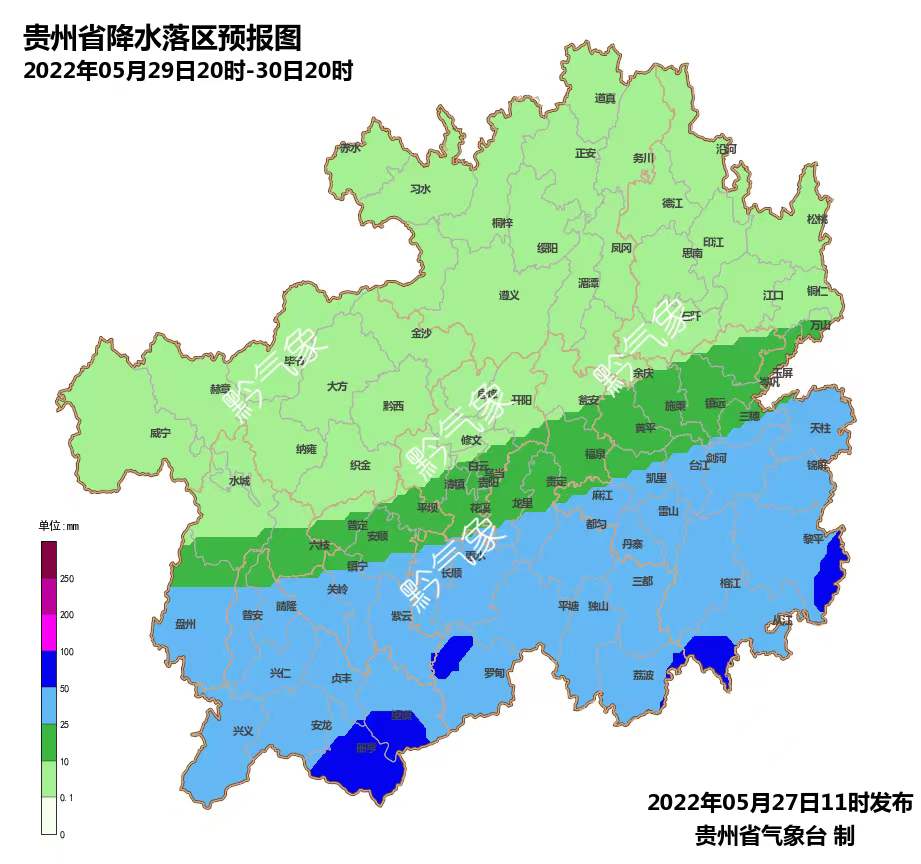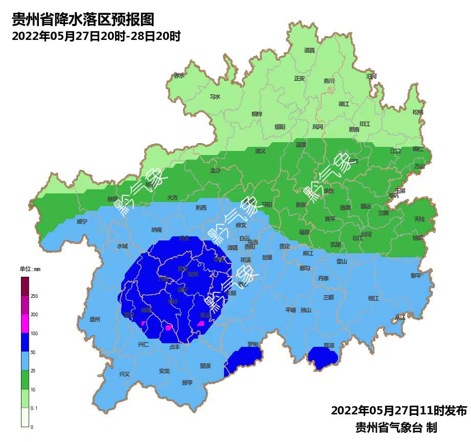 5月27日12时,贵州省气象台发布暴雨预报,预计今天夜间到28日白天,全省各地阴天有阵雨或雷雨,西部、南部地区有中到大雨,其中毕节市南部、六盘水市中东部、安顺市、黔西南州东北部、黔南州西部和南部的边缘地区局地有暴雨,个别乡镇有大暴雨。