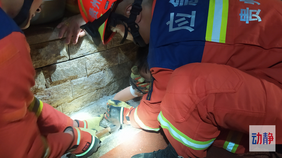 经现场观察,男孩手臂被卡在小区花园下水道的盖板缝里无法拔出,盖板由水泥浇筑成型,工作面狭小,液压扩张工具和双轮异向切割机都无法开展工作。消防员决定先用撬棍扩大盖板缝隙,再用角磨机锯出盖板缝隙两边的纹路,随后使用破拆工具一点一点地将盖板的中间隔段敲碎。最终,小男孩成功脱困,经医护人员检查,男孩的手并无大碍。