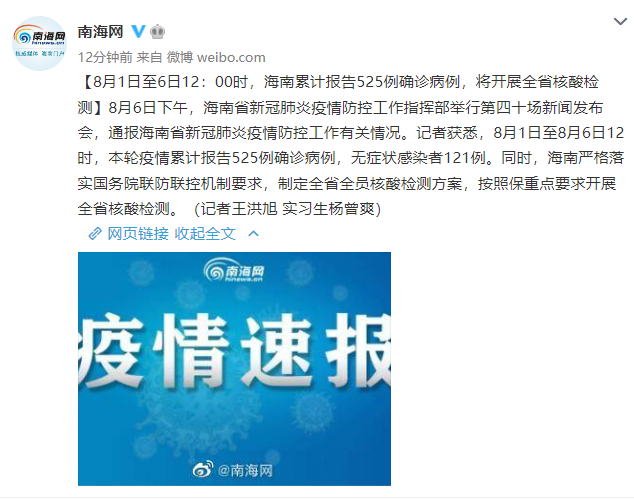 【8月1日至6日12:00时,海南累计报告525例确诊病例,将开展全省核酸检测】8月6日下午,海南省新冠肺炎疫情防控工作指挥部举行第四十场新闻发布会,通报海南省新冠肺炎疫情防控工作有关情况。记者获悉,8月1日至8月6日12时,本轮疫情累计报告525例确诊病例,无症状感染者121例。同时,海南严格落实国务院联防联控机制要求,制定全省全员核酸检测方案,按照保重点要求开展全省核酸检测。