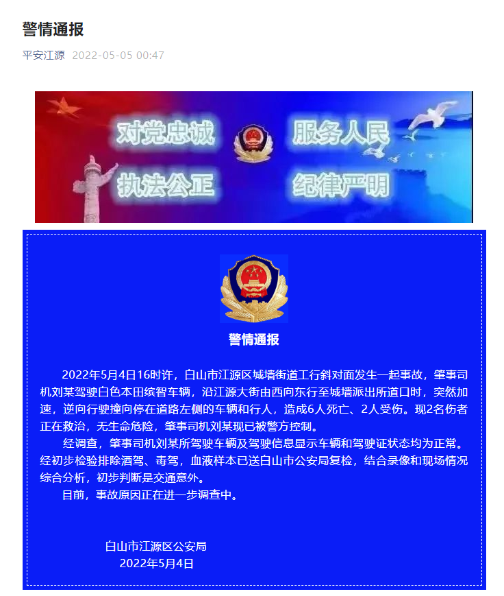2022年5月4日16时许,白山市江源区城墙街道工行斜对面发生一起事故,肇事司机刘某驾驶白色本田缤智车辆,沿江源大街由西向东行至城墙派出所道口时,突然加速,逆向行驶撞向停在道路左侧的车辆和行人,造成6人死亡、2人受伤。现2名伤者正在救治,无生命危险,肇事司机刘某现已被警方控制。