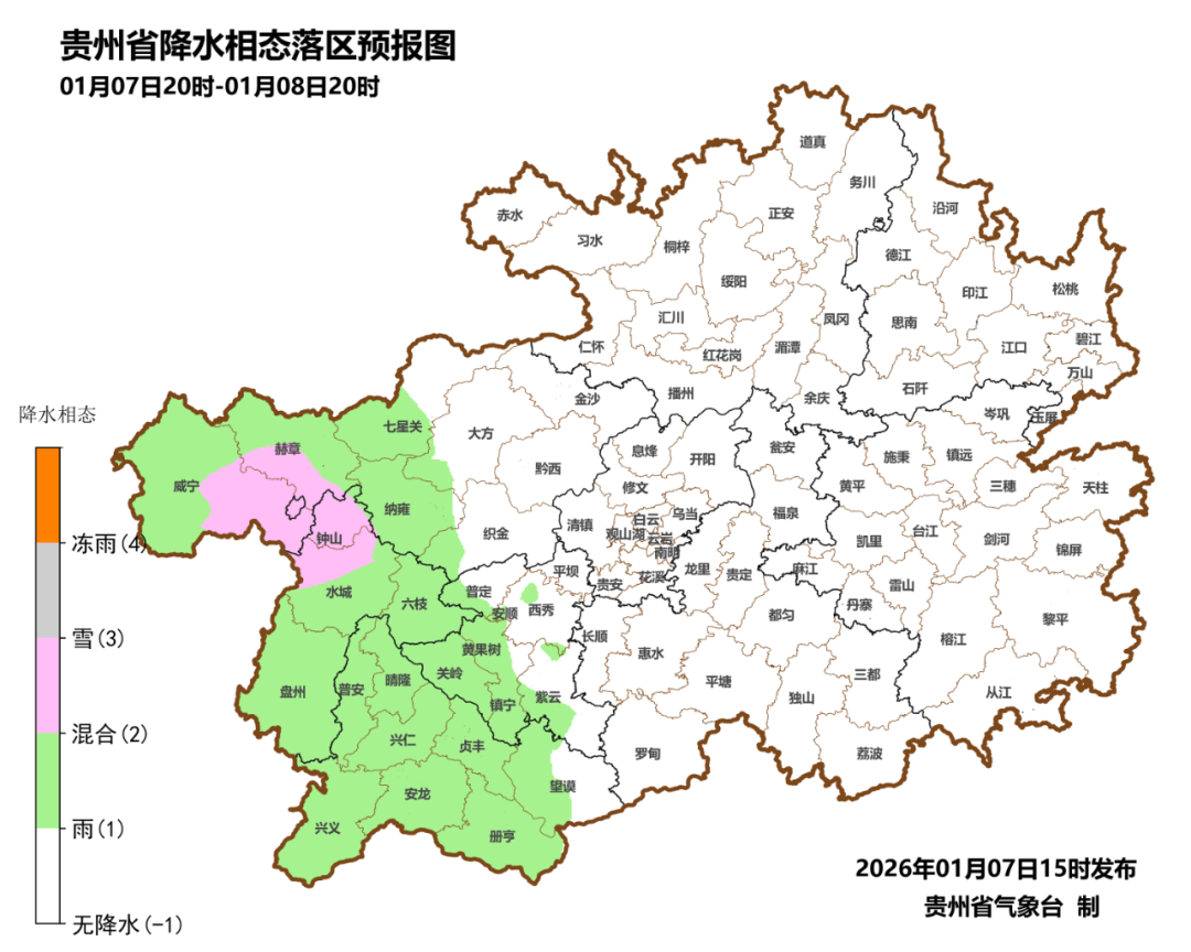 1月7日夜间到8日白天,省的西部地区阴天有零星小雨,西北部地区夜间有冻雨或雨夹雪,其余地区阴天间多云;