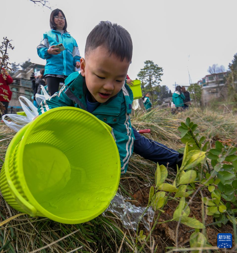 3月11日,在贵州省开阳县硒城街道,幼儿园的小朋友给种下的树苗浇水。新华社发(袁福洪 摄)