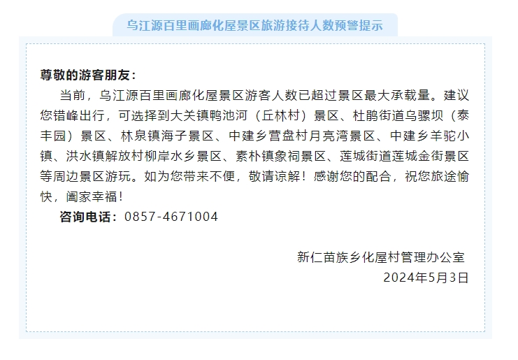 乌江源百里画廊化屋景区旅游接待人数预警提示