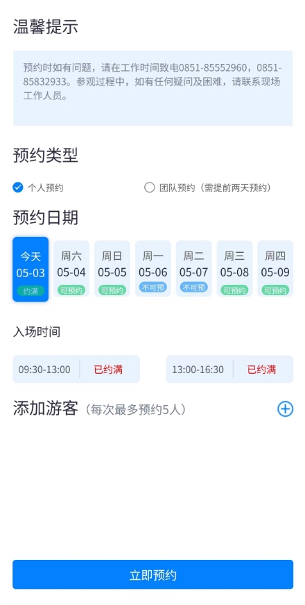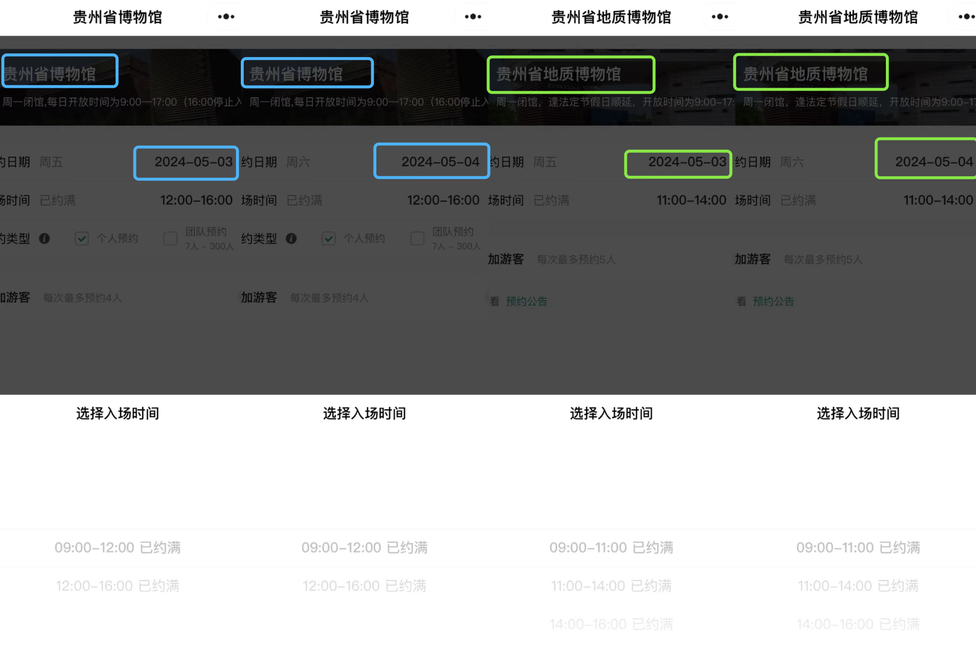 据贵州省博物馆、贵州省地质博物馆官方预约系统显示:今天(5月3日),明天(5月4日)入馆名额已约满,贵州省科技馆今天也已达到预约上限。