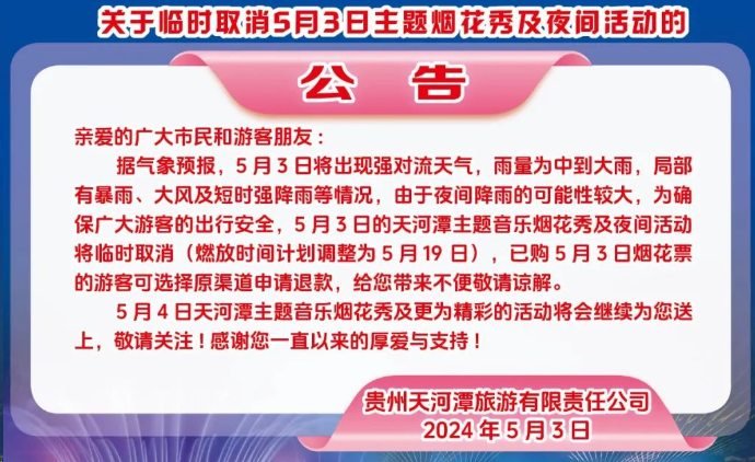关于临时取消5月3日主题烟花秀及夜间活动的公告