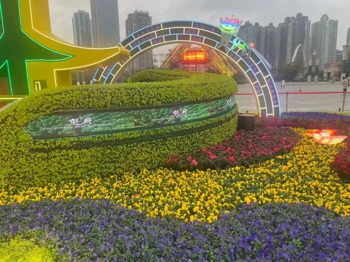 这组备受瞩目的立体花坛经过40余天的打造揭开了神秘面纱。花坛主体雕塑以贵阳的地标性建筑——甲秀楼造型为基底,巧妙地融入了“爽”字元素,生动展现了“爽爽贵阳”的城市魅力。花坛的右侧,一列高铁造型的绿雕蓄势待发,寓意着贵阳贵安正坚定不移地沿着高质量发展之路奋勇迈进。